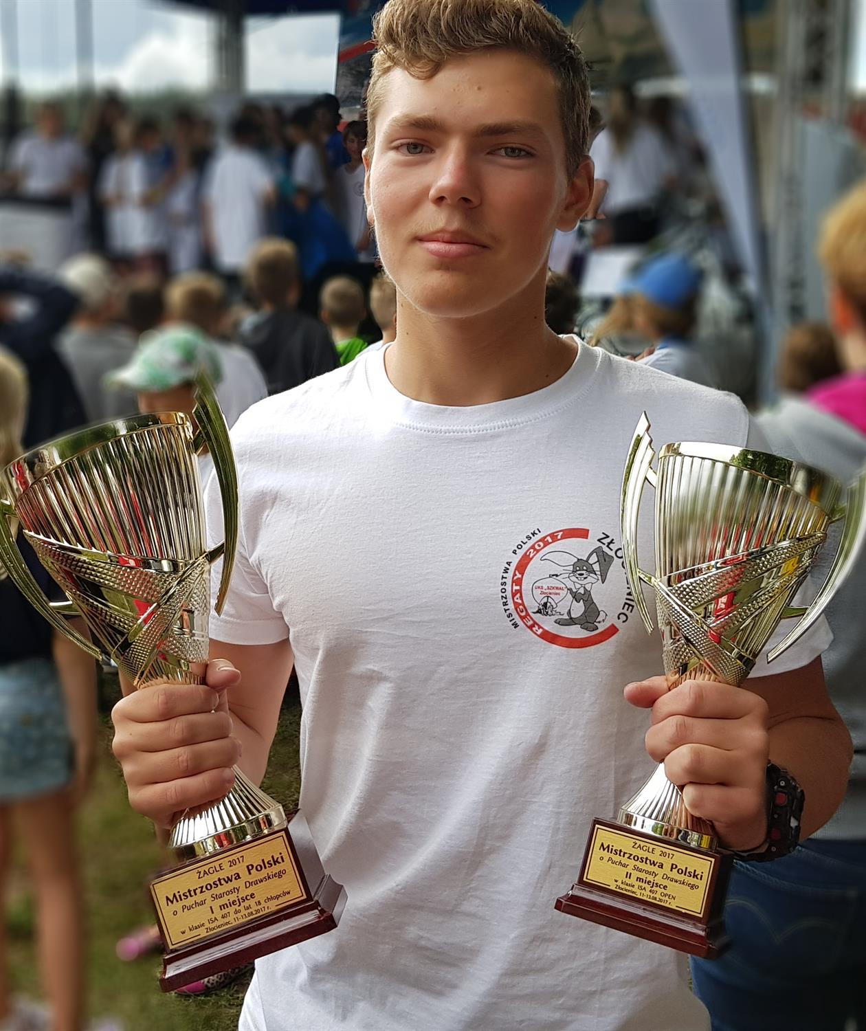 Na zdjęciu: Mateusz Szymczak z pucharami mistrza i wicemistrza Polski.