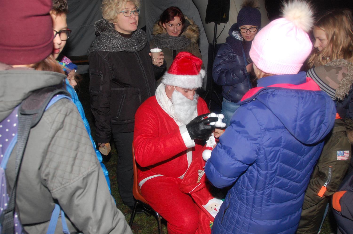 Głośnymi, chóralnymi okrzykami przywołano św. Mikołaja, który w końcu zjawił się z workiem prezentów. Kolejka po prezenty ustawiła się bardzo szybko.