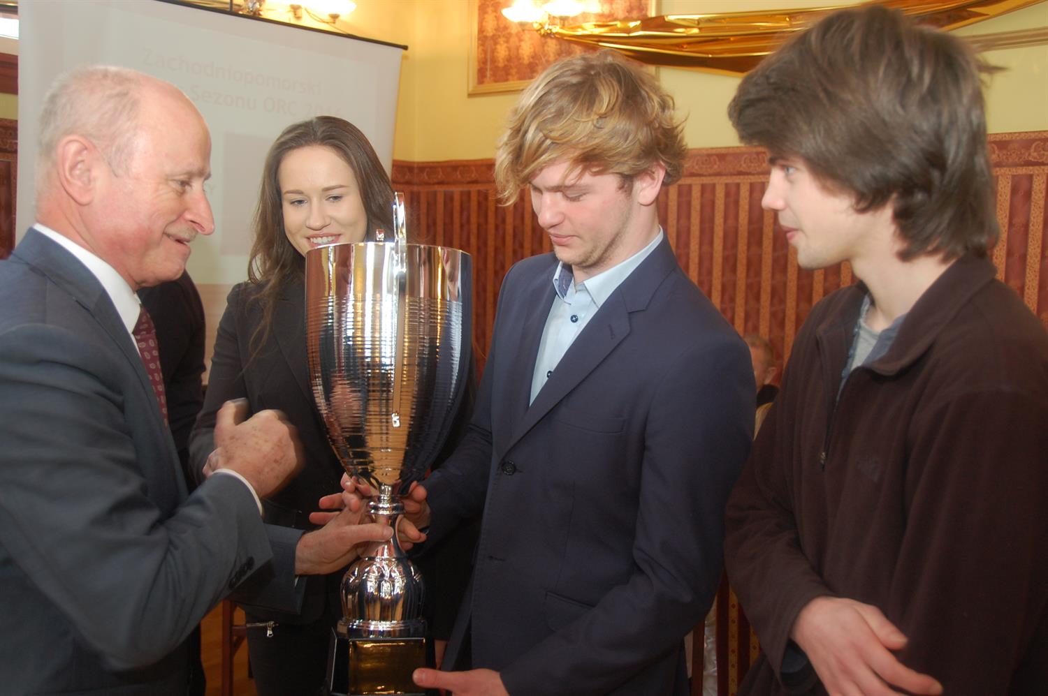 Na zdjęciach: Zbigniew Zalewski wręczył Michałowi Ławie Zachodniopomorski Puchar Sezonu ORC 2016 oraz Tomasza Chamera, wiceprezes i dyrektor sportowy PZŻ przywiózł dziesięć kompletów żagli do „Optimistów”.