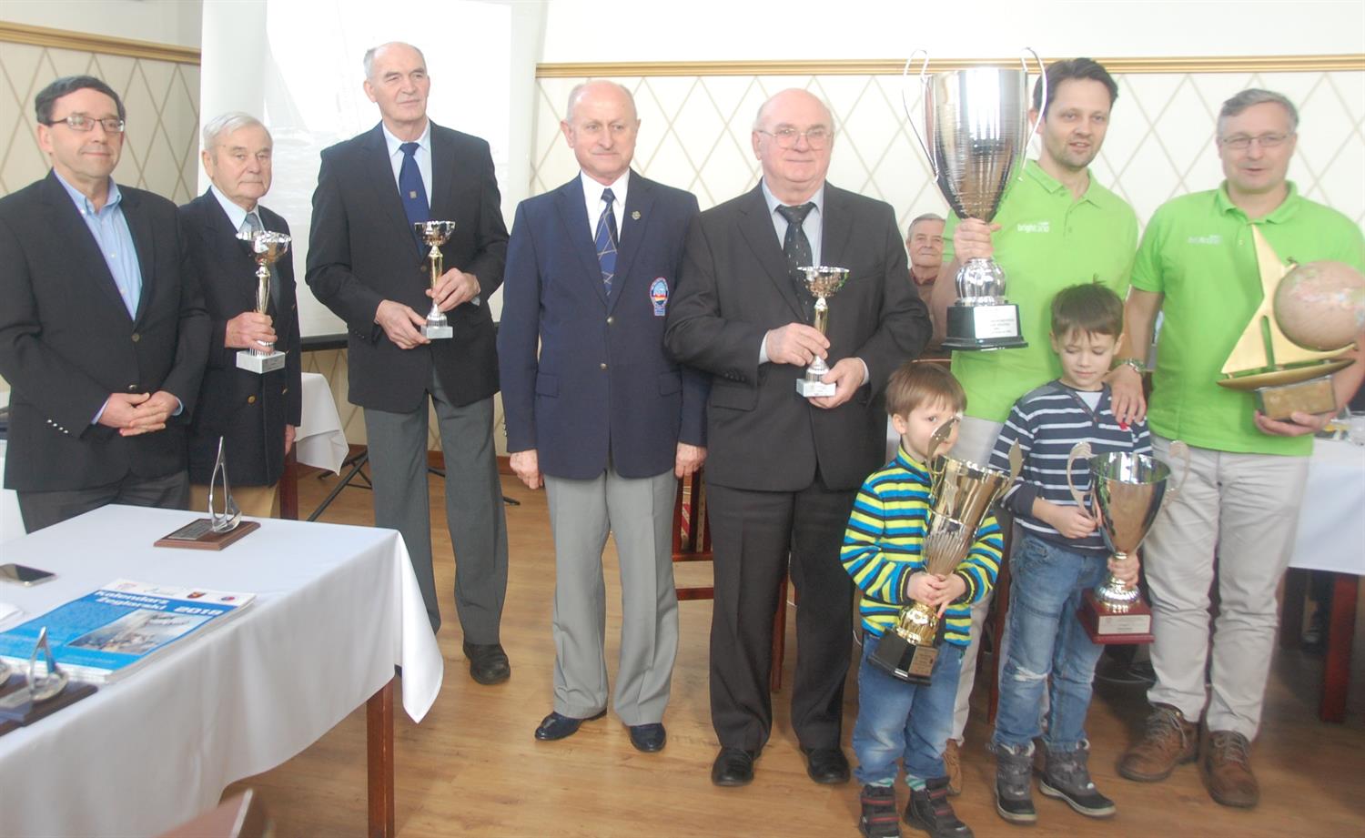Na zdjęciu: Zwycięscy zeszłorocznej punktacji żeglarskiej. (Od lewej) Andrzej Armiński - prowadzący uroczystość, Adam Lisiecki - najlepszy w kl. KWR I, Andrzej Sokołowski - KWR II, Zbigniew Zalewski - prezes ZOZŻ, Rudzik - Jerzy Stoek, i załoga Artura Pomorskiego.