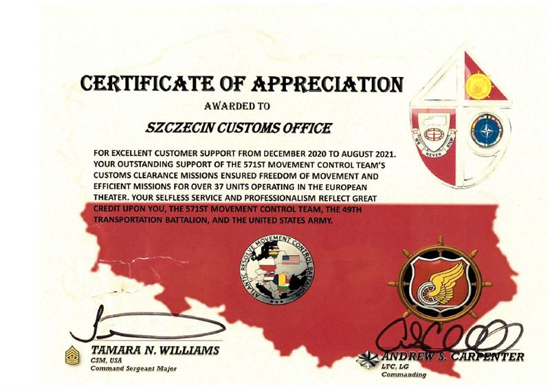 Funkcjonariusze otrzymali certyfikat w podziękowaniu „za doskonałą obsługę klienta od grudnia 2020 r. do sierpnia 2021 r. za wybitne wsparcie 571 grupy kontroli ruchu przy odprawach celnych, które zapewniło swobodę przemieszczania się i sprawne misje dla ponad 37 jednostek działających na scenie europejskiej. Wasza bezinteresowna służba i profesjonalizm odzwierciedlają wielkie uznanie dla Was, od 571. zespołu kontroli ruchu, 49. batalionu transportowego i armii Stanów Zjednoczonych ” - napisano w certyfikacie.