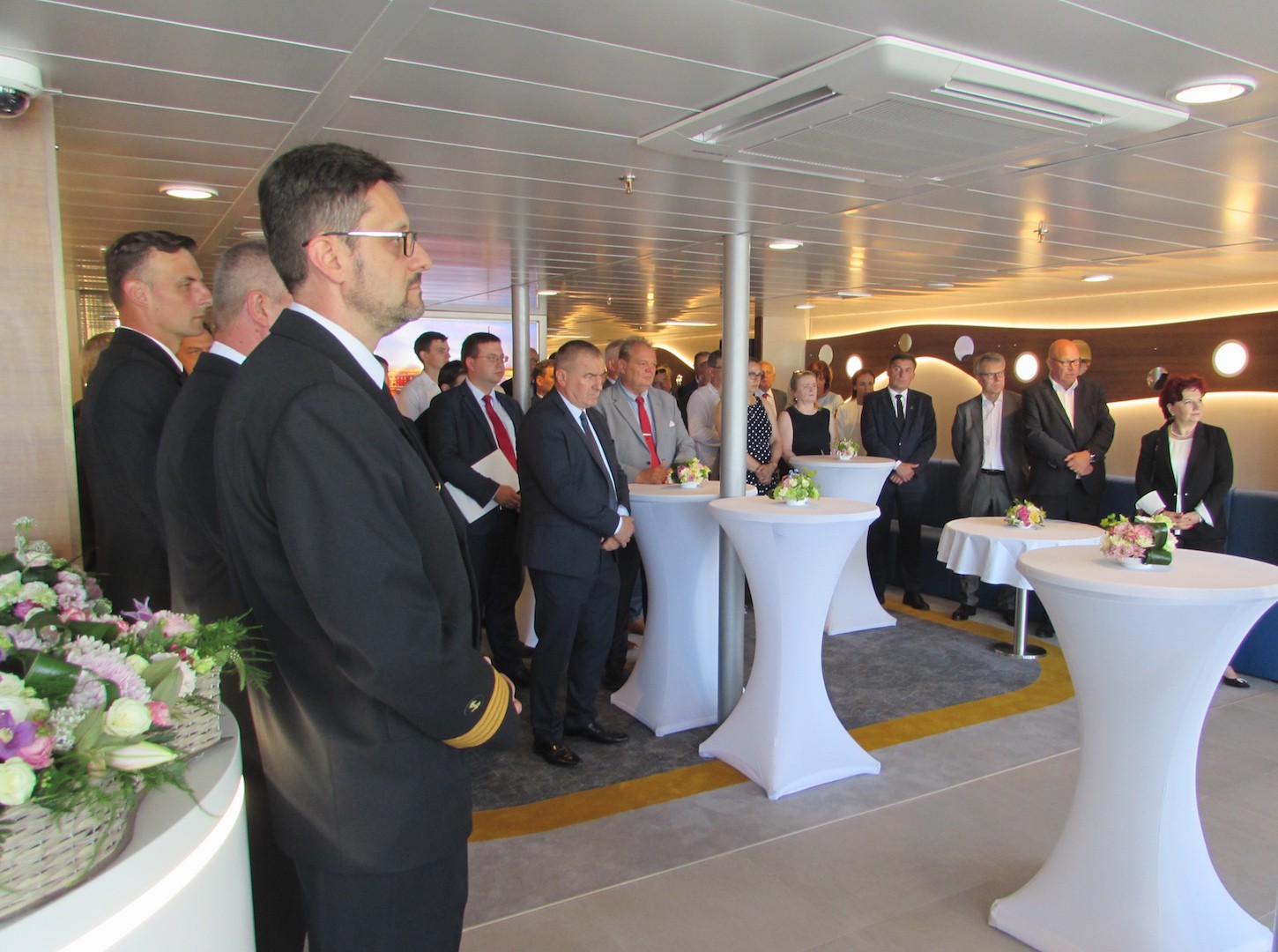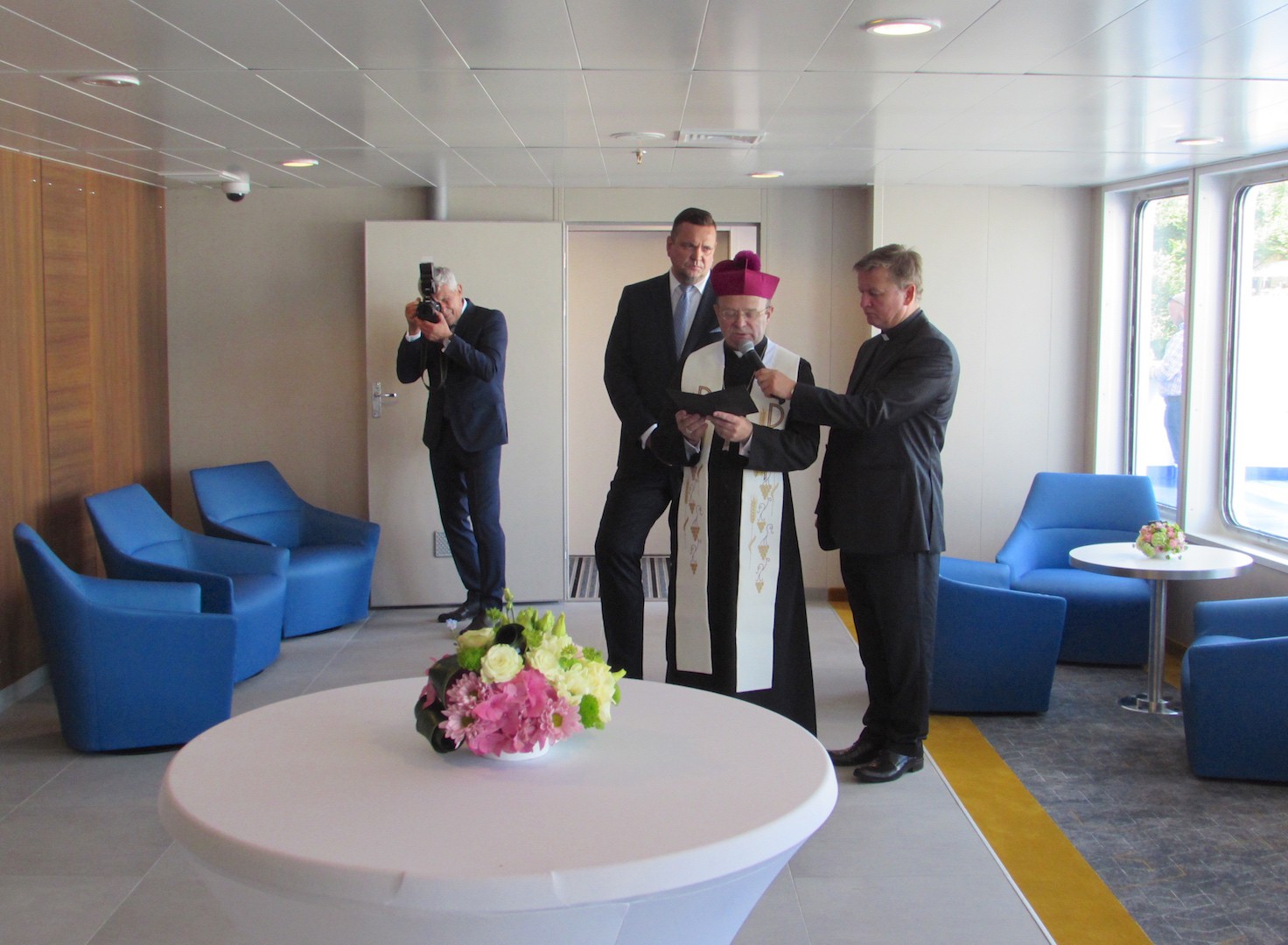 W uroczystości na pokładzie „Copernicusa” wzięli udział przedstawiciele branży morskiej z regionu. Był też Maciej Styczyński, naczelnik Wydziału Przemysłu Okrętowego w Ministerstwie Gospodarki Morskiej i Żeglugi Śródlądowej, który w imieniu szefa resortu Marka Gróbarczyka odczytał okolicznościowe przesłanie. Prom został poświęcony przez ks. bpa Henryka Wejmana.