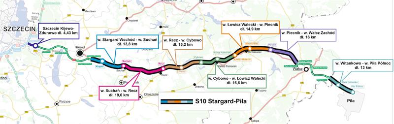 S10 Szczecin – Piła będzie dwujezdniową drogą ekspresową z dwoma pasami ruchu w każdą stronę. Wybudowany zostanie fragment łączący węzeł Szczecin Kijewo (autostrada A6) z gotowymi już odcinkami od Zdunowa (granica Szczecina) do końca obwodnicy Stargardu oraz siedem odcinków od Stargardu do Piły (z wyłączeniem funkcjonującej już od 2020 roku obwodnicy Wałcza).