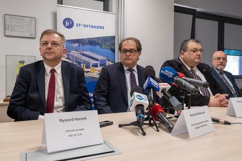 Na zdjęciu (od lewej): minister Gróbarczyk, wiceprezes, p.o. prezesa ST3 Offshore Cezary Krasodomski, członek zarządu MS TFI Ryszard Haczek, naczelnik Styczyński, prezes MSR „Gryfia” Krzysztof Zaremba i prezes Stoczni Szczecińskiej Marek Opowicz.