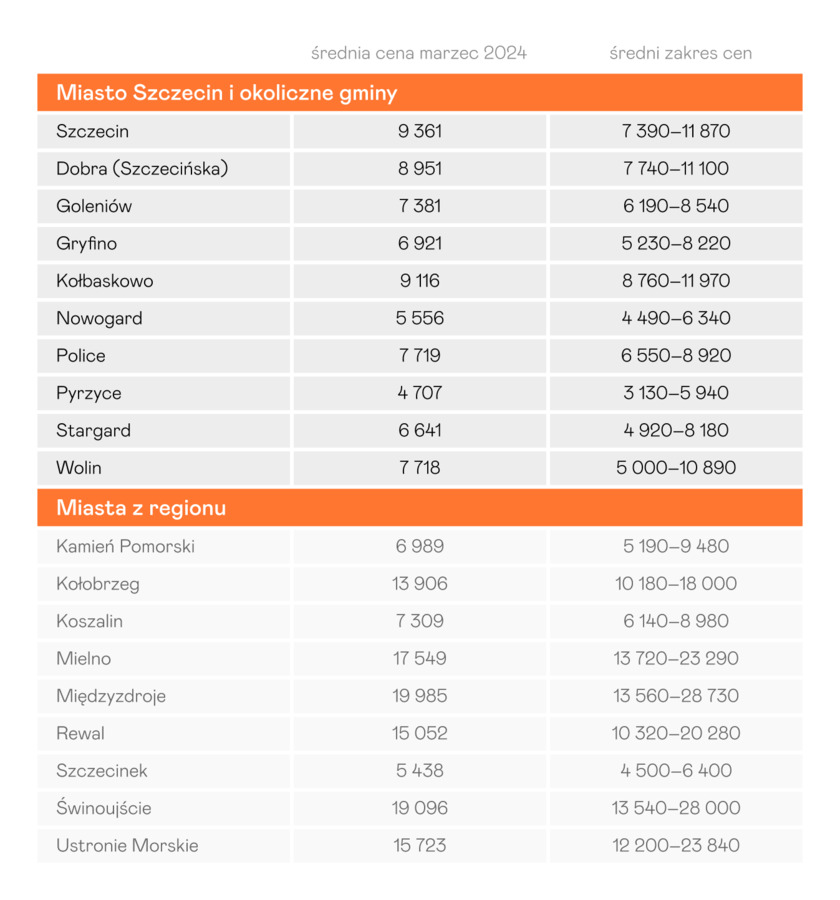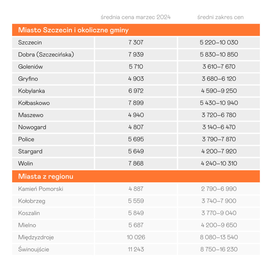 W stolicy województwa zachodniopomorskiego oraz gminach ościennych metr kwadratowy mieszkania kosztuje od 3 130 zł do 11 970 zł. Jak widać, rozstrzał cen jest bardzo duży. Średnia cena mkw w Szczecinie w marcu 2024 roku wyniosła 9 361 zł, a zakres cen oscylował pomiędzy 7 390 zł a 11 970 zł.