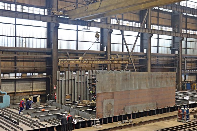 Coraz więcej doku na hali w Stoczni Szczecińskiej „Wulkan”. Przypomnijmy, że przyszły obiekt będzie użytkowała Morska Stocznia remontowa „Gryfia”. Dok będzie miał ok. 235,6 m długości, 47 m szerokości oraz 27 tysięcy ton nośności. Inwestorem jest Fundusz Rozwoju Spółek, będący właścicielem zarówno „Gryfii”, jak i SS Wulkan. Na zdjęciu montaż ściany i wręgu dennika oraz „przygotowania do rozszerzenia frontu robót w zakresie prefabrykacji zasadniczej” – informują stoczniowcy.