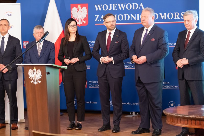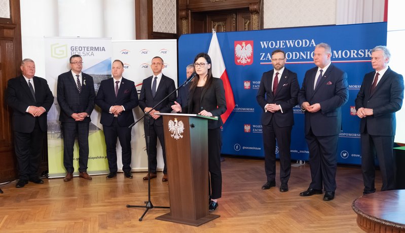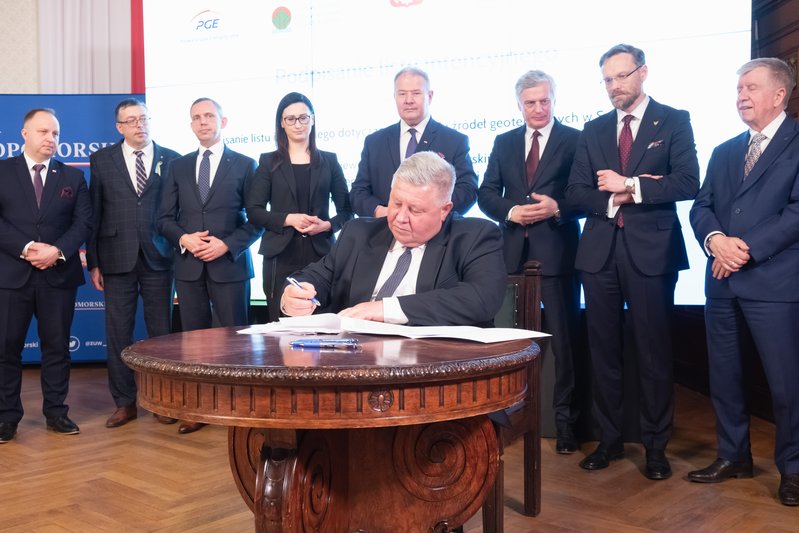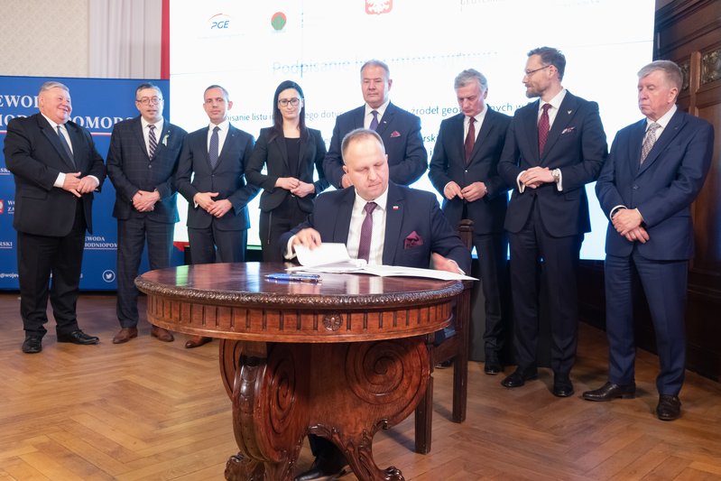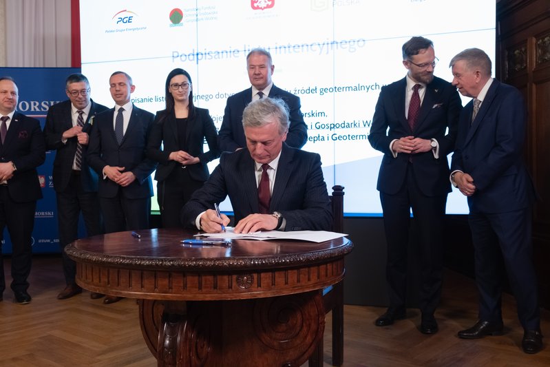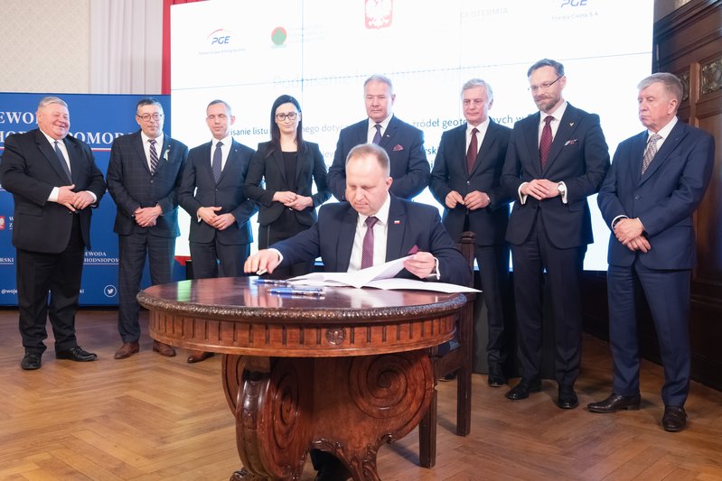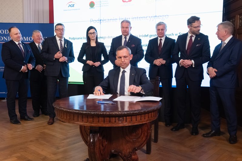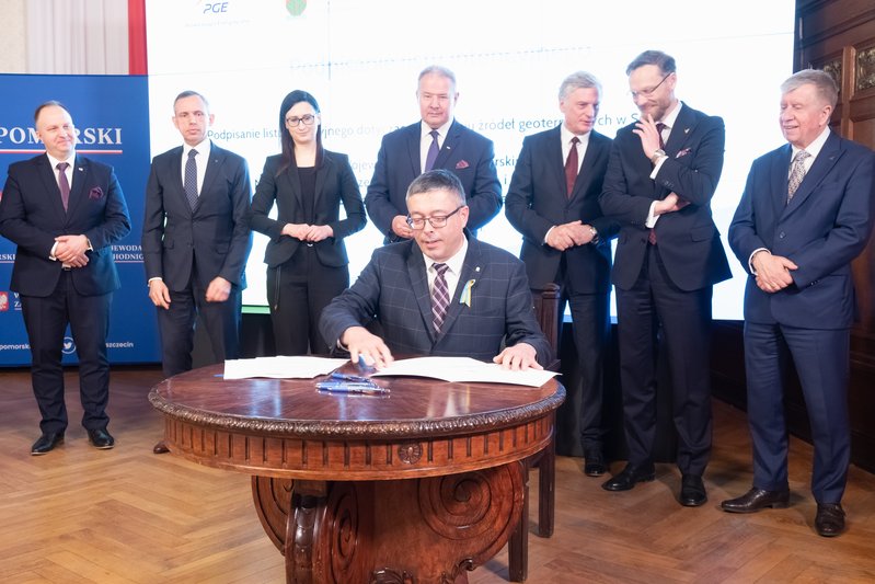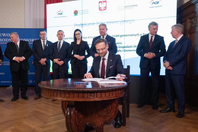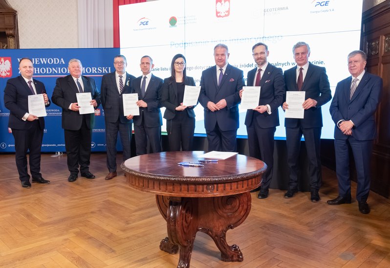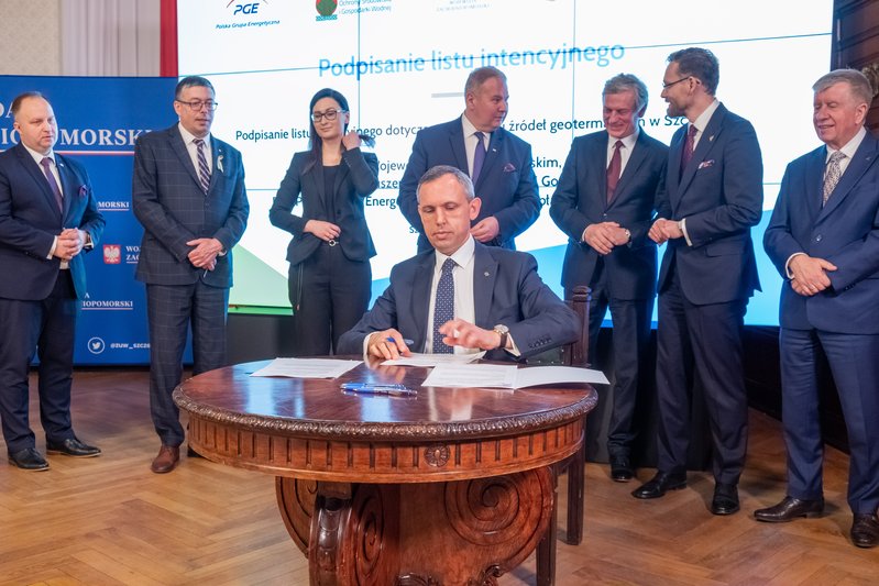 List intencyjny w sprawie rozwoju źródeł geotermalnych w Szczecinie podpisali: wiceprezesi NFOŚiGW Paweł Mirowski i Artur Michalski, wiceprezes PGE Ryszard Wasiłek, dyrektor szczecińskiego oddziału spółki PGE Energia Cieplna Wojciech Sobczak, prezes Geotermii Polska Łukasz Białczak oraz wojewoda Zbigniew Bogucki.