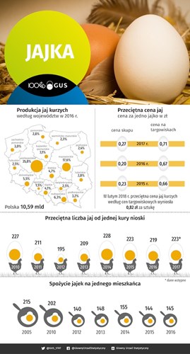 Wzrosła cena jajek – w 2017 r. na targowisku płaciliśmy za nie 71 gr (rok wcześniej 67 gr). Wzrosła też liczba jaj znoszonych przez przeciętną kurę – w 2017 r. były to 223, a w 2016 r. – 219 sztuk.