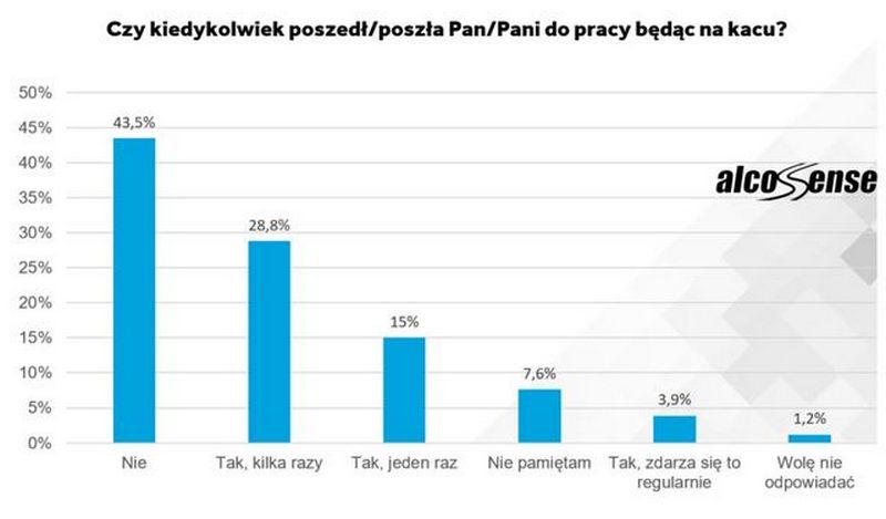 Chociaż 43,5 proc. Polaków deklaruje, że nigdy nie poszła do pracy na tzw. kacu, to jednak równie liczne jest grono tych, którzy się przyznają, że zdarzyło im się to jeden lub kilka razy (43,8 proc.). Tak wynika z badania przeprowadzonego dla AlcoSense Laboratories.