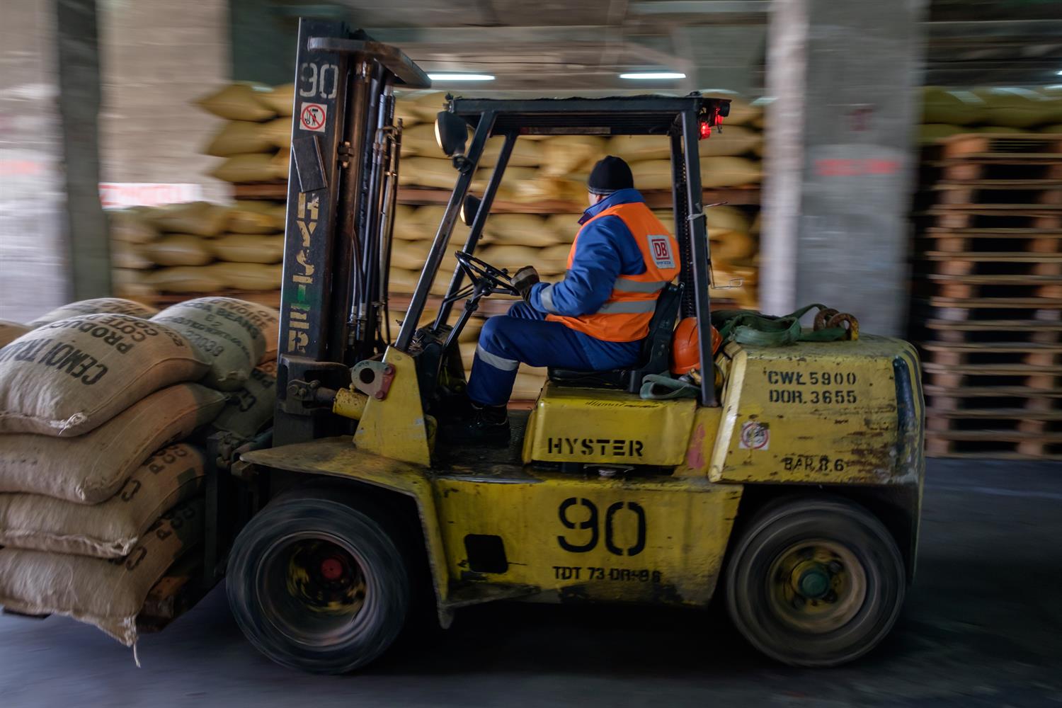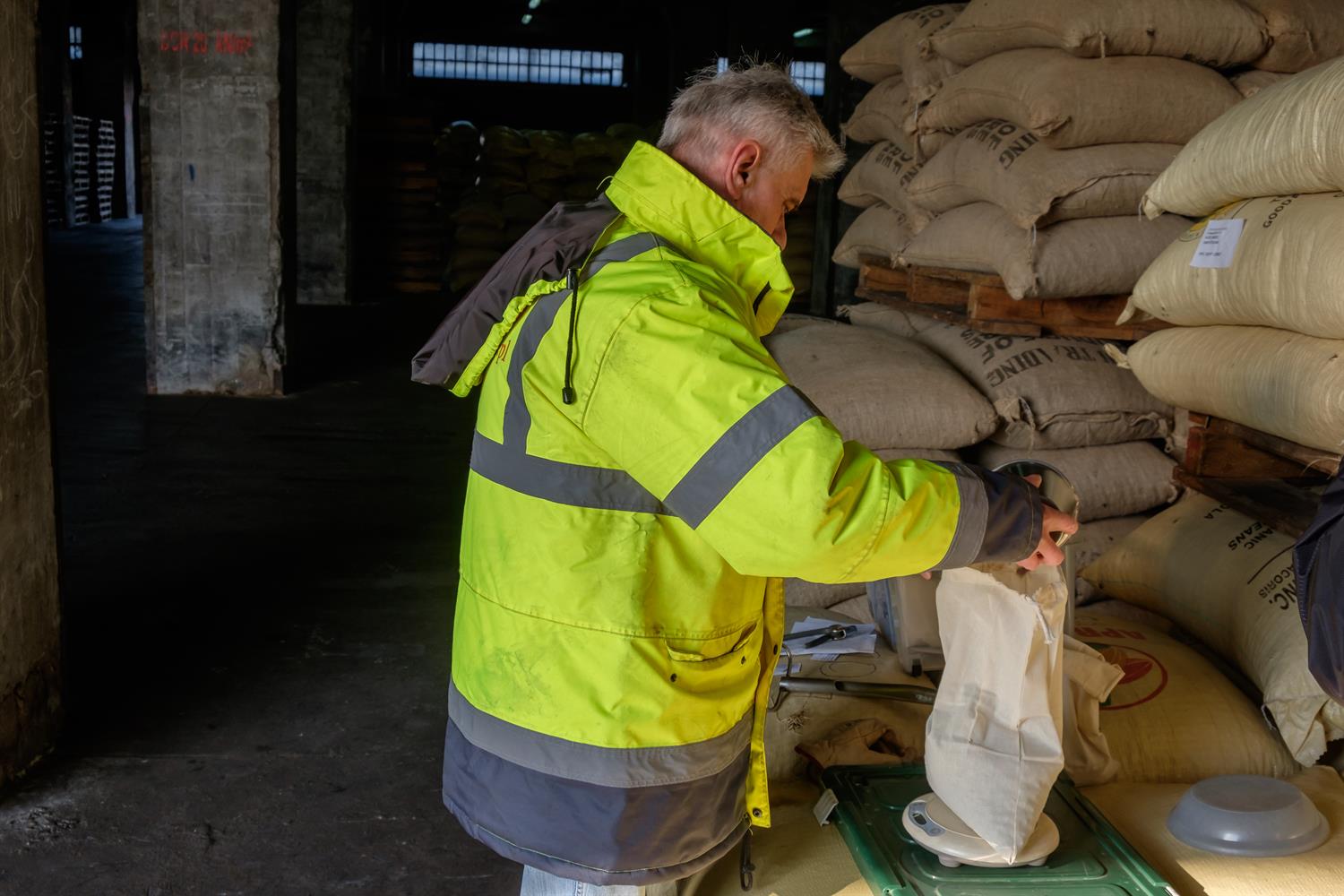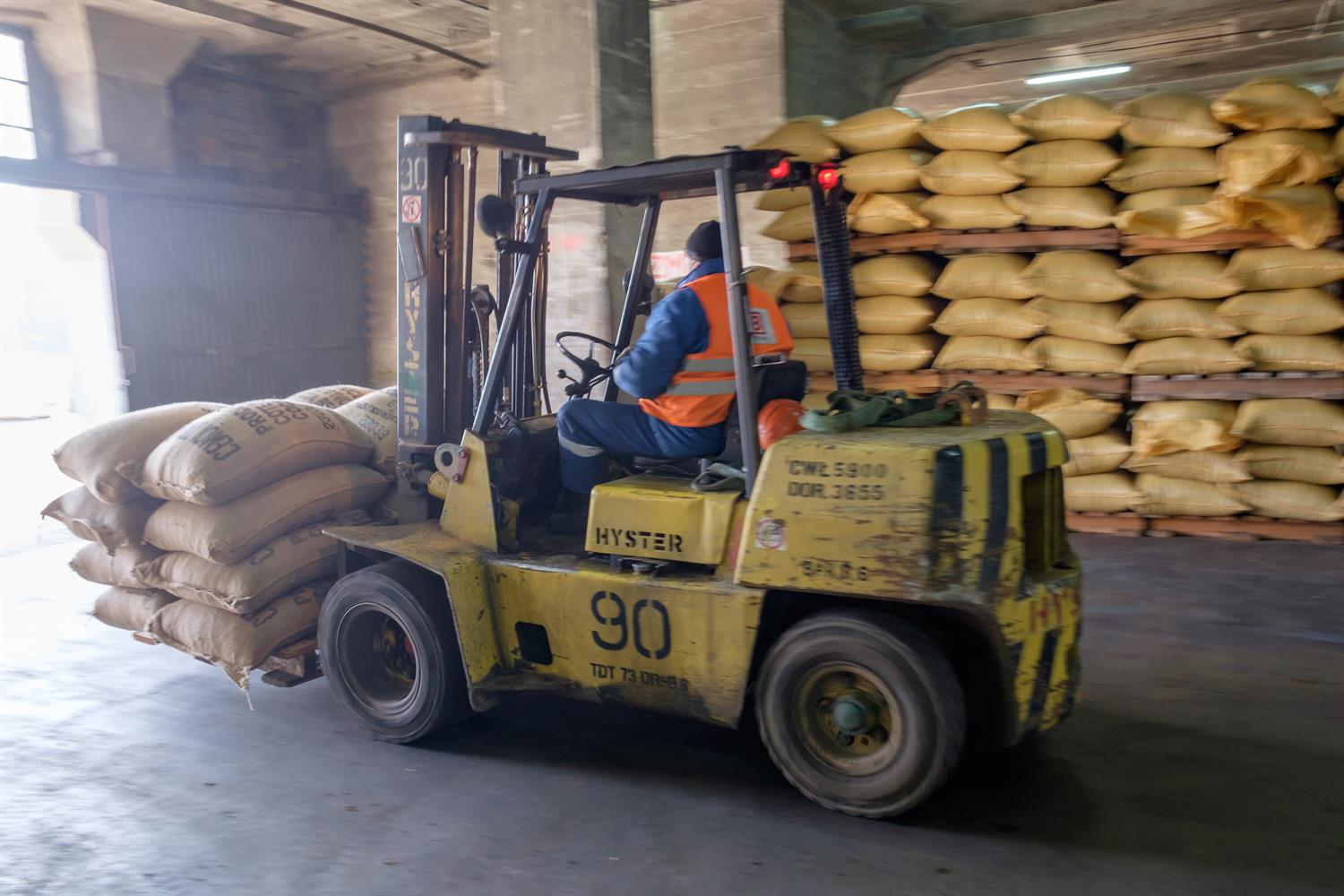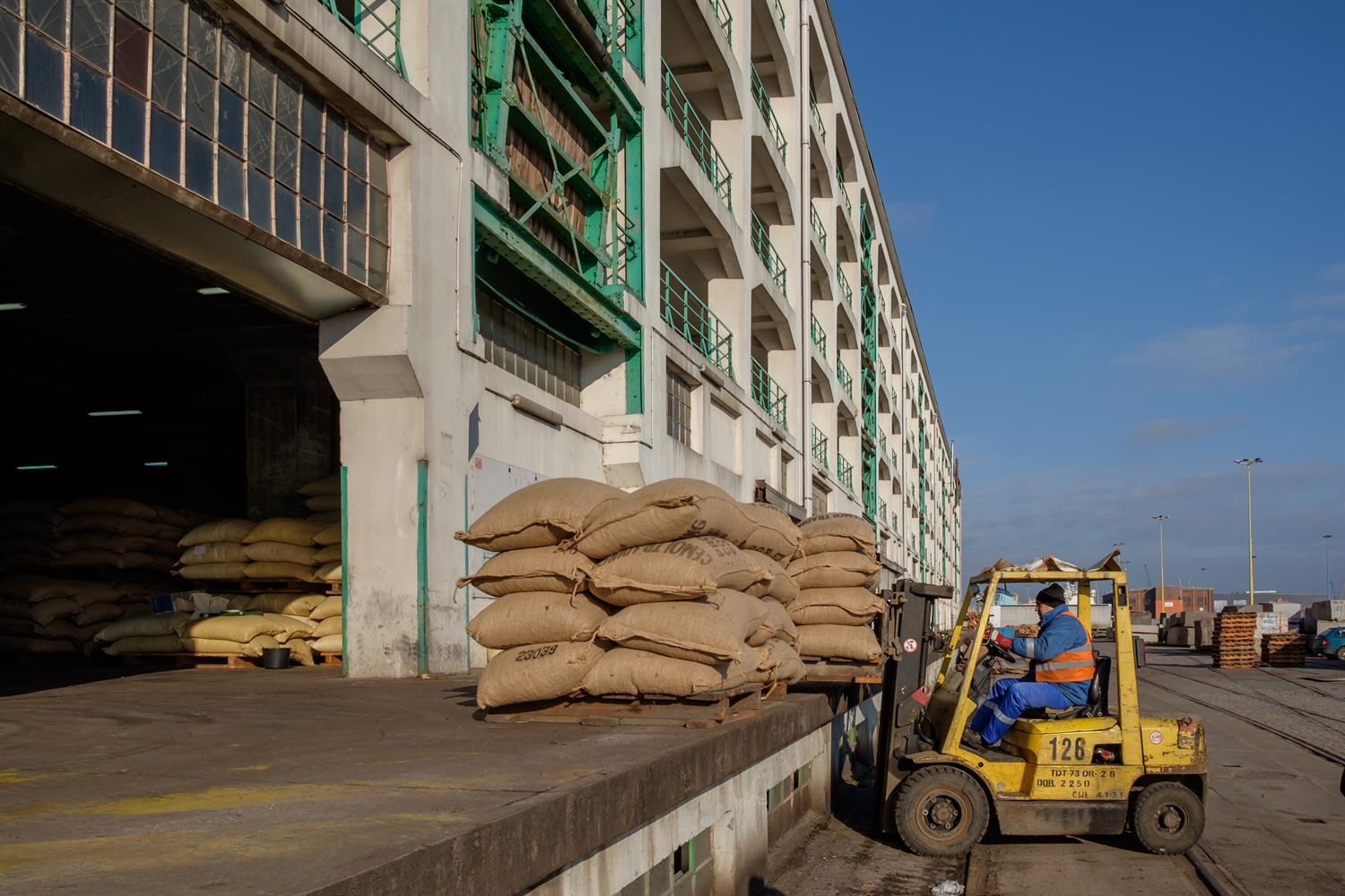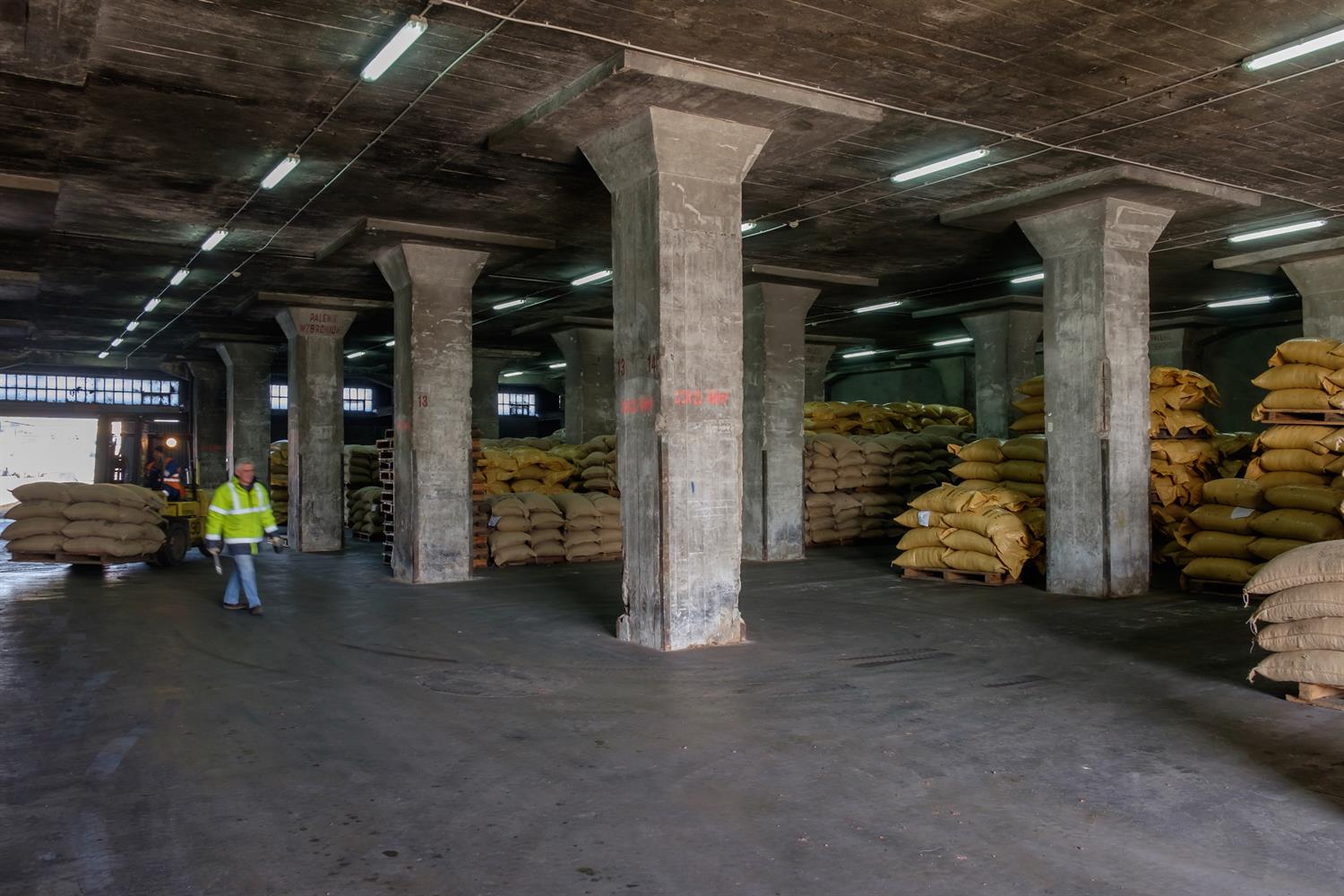 Ziarno kakaowe przypływa w kontenerach, zapakowane w worki (po ok. 70 kg). Kontenery muszą być zwolnione jak najszybciej, dlatego rozładunek musi być przeprowadzony sprawnie. Worki z ziarnem są ręcznie przekładane na portowe palety i przewożone do magazynu nr 7, a tam rozmieszczane przy pomocy układarki. Obecnie są składowane na parterze i pierwszym piętrze.