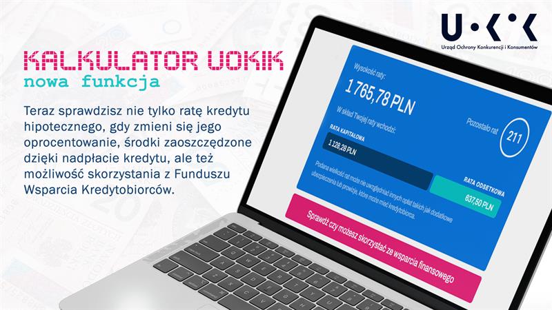 Orientacyjna wysokość raty kredytu w przypadku wzrostu stóp procentowych, środki zaoszczędzone dzięki nadpłacie, a od teraz także możliwość skorzystania z Funduszu Wsparcia Kredytobiorców – to wszystko da się sprawdzić w kalkulatorze Urzędu Ochrony Konkurencji i Konsumentów. Jest udostępniony na stronie: finanse.uokik.gov.pl.