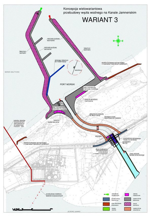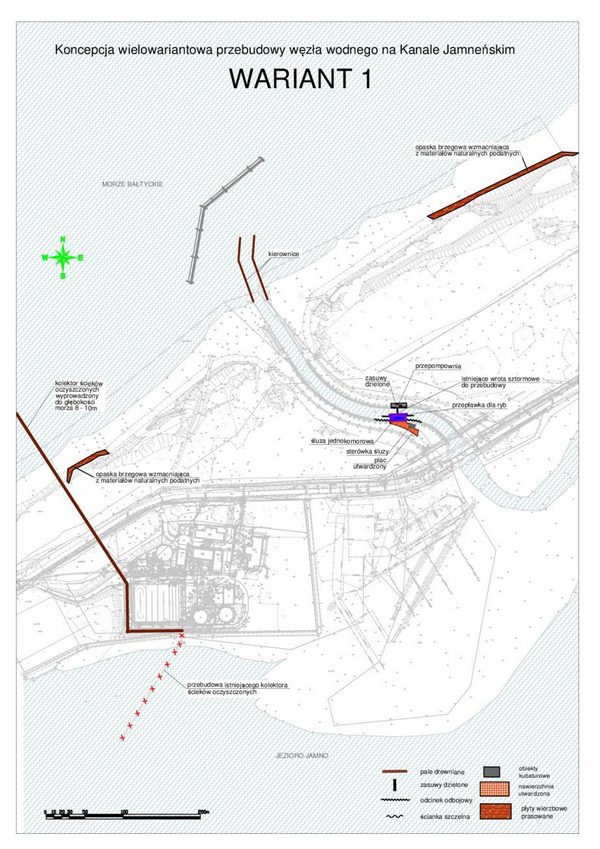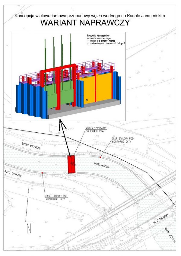 W przygotowanej „Koncepcji wielowariantowej przebudowy węzła wodnego na Kanale Jamneńskim”, która zostanie omówiona podczas spotkań konsultacyjnych, program naprawczy przewiduje trwałe otwarcie skrzydeł wrót sztormowych. Dalej podzielenie czteroprzęsłowej konstrukcji: w części zachodniej wykonanie komorowej przepławki dla migracji ryb w obu kierunkach, niezależnie od stanu wody w jeziorze i w morzu, a we wschodniej sekcji wstawienie zasuw płaskich dwudzielnych, umożliwiających sterowanie poziomami wody w jeziorze. Jak również montaż zasuw w pełni sterowalnych, co przy otwarciu umożliwi przepływ wody i organizmów żywych przy dnie kanału w kierunku morza i jeziora.