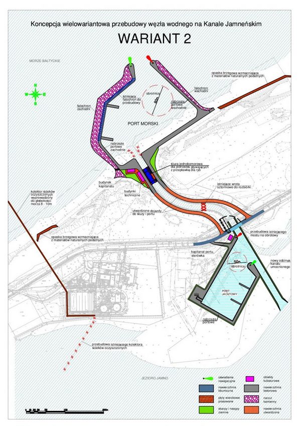 Te założenia prezentuje wariant nr 1 wraz z modernizacją istniejących opasek brzegowych Bałtyku i na wylocie kanału do morza budowę kierownic z palisad drewnianych. Pozostałe propozycje są bardziej ambitne, bo zakładają budowę zewnętrznego portu morskiego wraz z infrastrukturą (w wariancie 2. także portu wewnętrznego), śluzy jednokomorowej wraz z przepławką dla ryb typu szczelinowego, kanału żeglownego prowadzącego bezpośrednio do jeziora, budowę mostu obrotowego w ciągu istniejącej drogi powiatowej oraz modernizację istniejących opasek brzegowych Bałtyku.