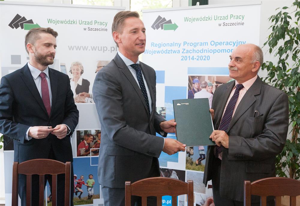 Na zdjęciu: od prawej dyr. H. Ręcławowicz, marszałek O. Geblewicz z pierwszą z pierwszych umów z nowego RPO, oraz dyrektor WUP Andrzej Przewoda