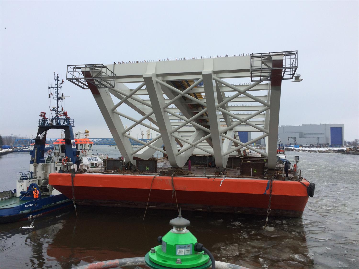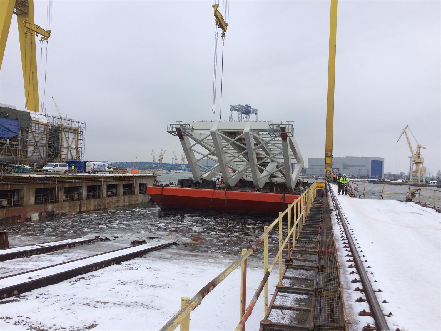 W minionym tygodniu, za pomocą suwnicy bramowej na pochylni Wulkan, dwie pierwsze części załadowano na ponton „Carrier-10”.