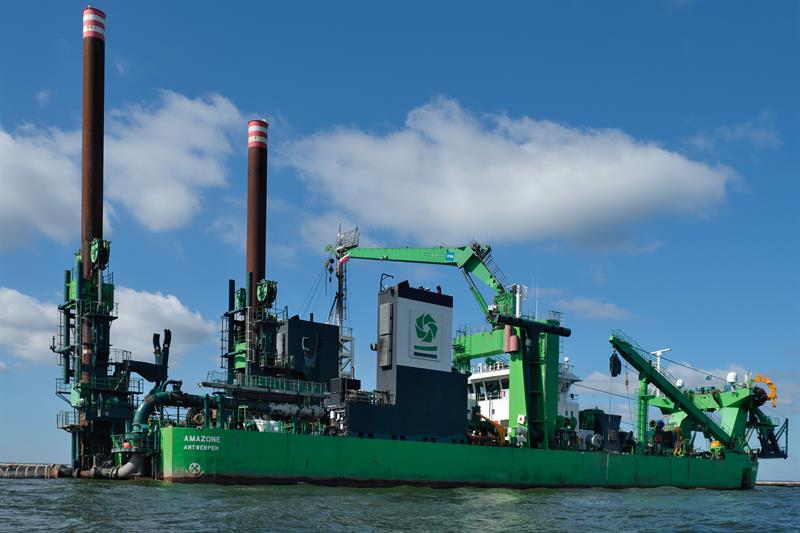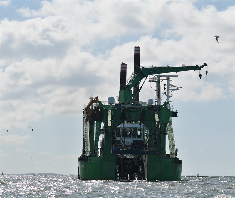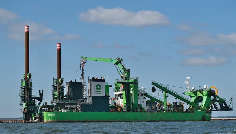 Trwają intensywne prace związane z modernizacją toru wodnego Świnoujście – Szczecin do głębokości 12,5 m. Pogłębiarka „Amazone” do końca czerwca br. – w ciągu 1,5 miesiąca – wybagrowała ok. 3,4 mln m sześc. urobku z dna toru na Zalewie Szczecińskim. Z tego materiału budowane są dwie wyspy.