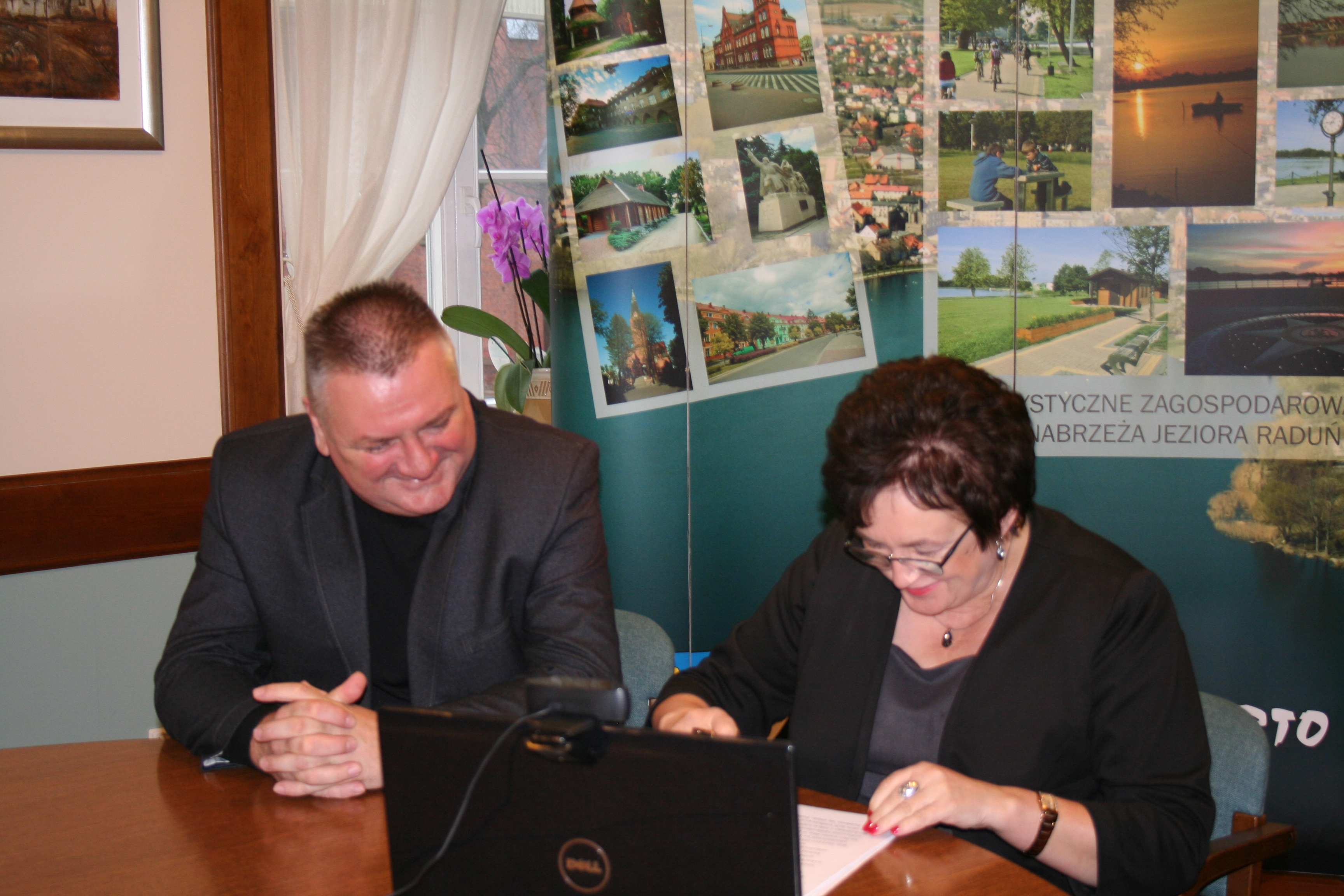 Na zdjęciu burmistrz Wałcza Bogusława Towalewska i Andrzej Kowalczyk dyrektor naczelny EKOMECH w Wałczu czekają na połączenie przez internet z uczestnikami konferencji biznesowej w Chmielnickim.