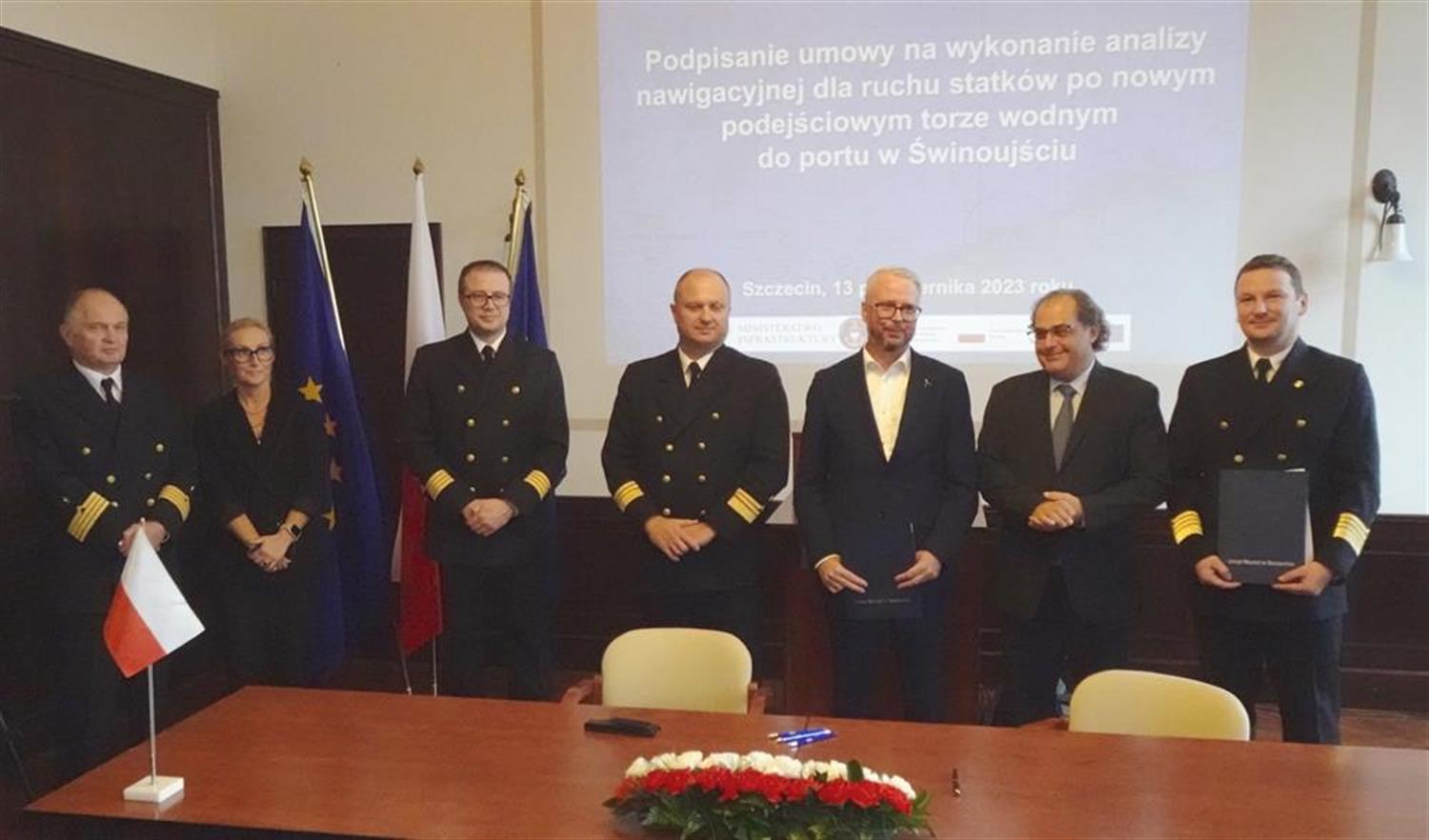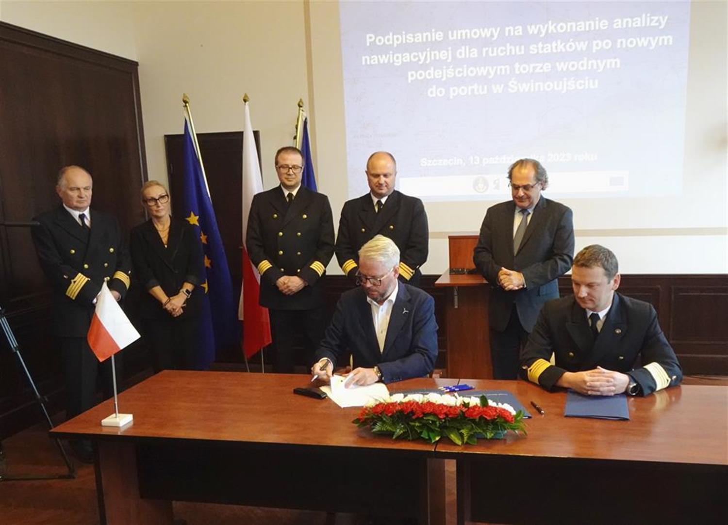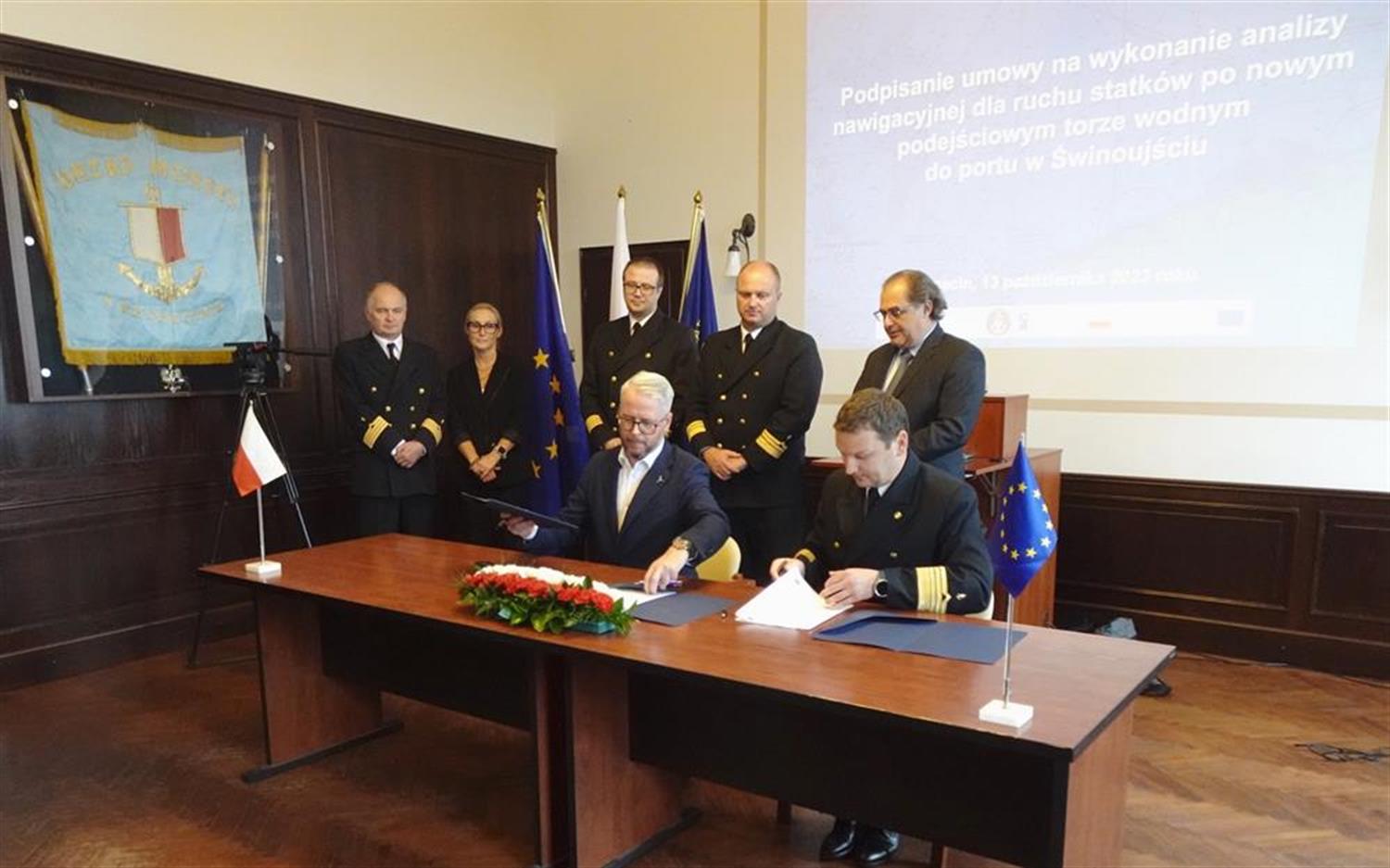 W siedzibie Urzędu Morskiego w Szczecinie podpisano w piątek (13 października) umowę z Biurem Projektów Budownictwa Morskiego „Projmors” z Gdańska na wykonanie analizy nawigacyjnej dla ruchu statków po nowym podejściowym torze wodnym do portu w Świnoujściu. Umowę zawarto w obecności wiceministra infrastruktury Marka Gróbarczyka. Jej wartość to 602 700 złotych, a termin wykonania – koniec lutego 2024 roku.