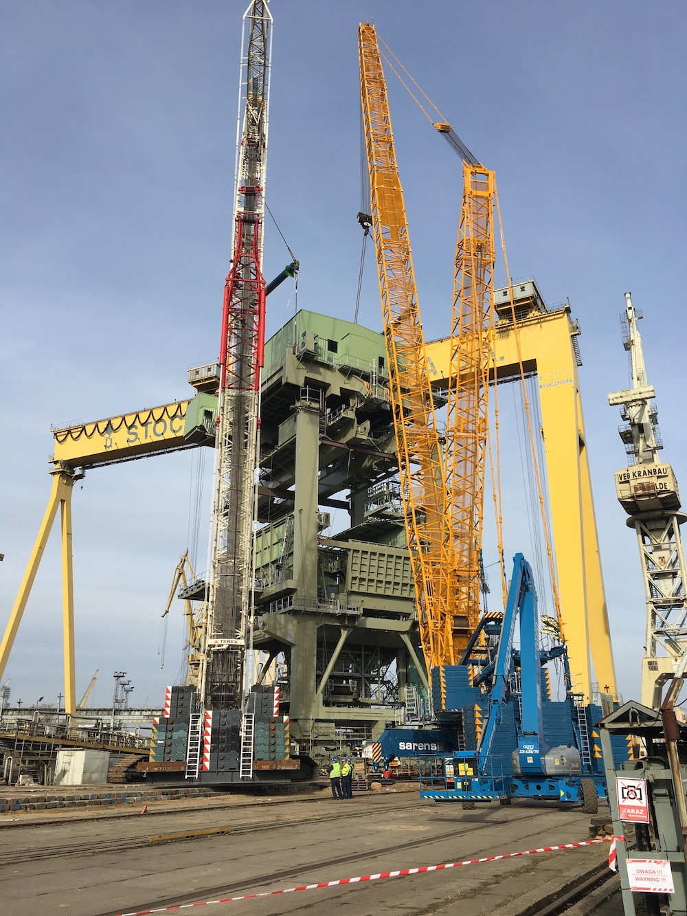 – Przez tydzień wjechało do stoczni około stu ciężarówek, które przywiozły części dźwigów oraz specjalne maty, na których złożone żurawie pracowały – mówi R. Sikora. – Dokonanie takiej operacji było możliwe dzięki dobrej współpracy z firmą ThyssenKrupp, Sarens, a także z zarządem i pracownikami Szczecińskiego Parku Przemysłowego – Stoczni Szczecińskiej, którzy między innymi uruchomili dla nas dodatkową bramę wjazdową.