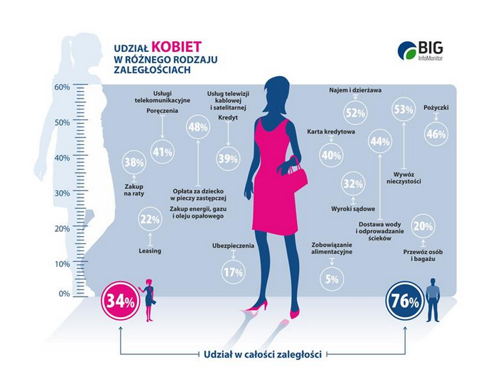Aby nie było tak sielankowo, warto dodać, że panie – podobnie jak panowie – mają problem z fakturami za prąd i gaz. Odsetek kobiet w grupie dłużników „zwiększa się w przypadku takich kategorii, jak poręczenia kredytów, nieopłacanie rachunków za telefon i za telewizję kablową, opóźnienia w spłacie kredytów, przeterminowane zadłużenie na kartach kredytowych oraz nieopłacone zakupy ratalne. Ich udział wynosi tu między 39 a 46 procent” - oszacował w badaniu Millward Brown na zlecenie BIG InfoMonitor.