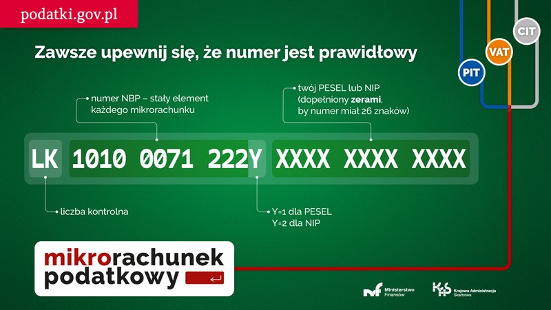 * w wygodny i prosty sposób zapłacisz PIT, CIT i VAT na jeden, stały, indywidualny mikrorachunek podatkowy - nie będziesz już wybierać oddzielnych rachunków,