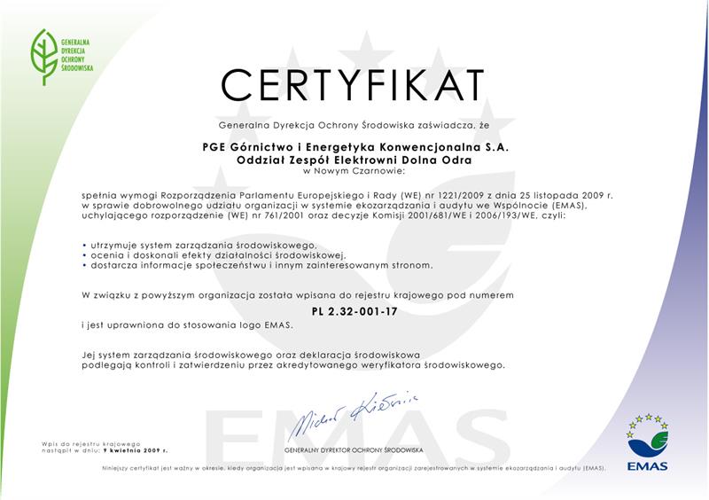 Elektrownia Opole, która jako pierwsza organizacja w Polsce w 2005 r. wdrożyła europejski system EMAS, otrzymała w tym roku jubileuszowy certyfikat. To szczególne wyróżnienie otrzymało jedynie dziesięć najdłużej działających organizacji zarejestrowanych w systemie EMAS. Elektrownia Dolna Odra, która jako pierwsza w województwie zachodniopomorskim, a jako trzecia w kraju elektrownia zawodowa zarejestrowała się w systemie EMAS, otrzymała od audytorów pozytywną rekomendację do utrzymania jej w rejestrze.