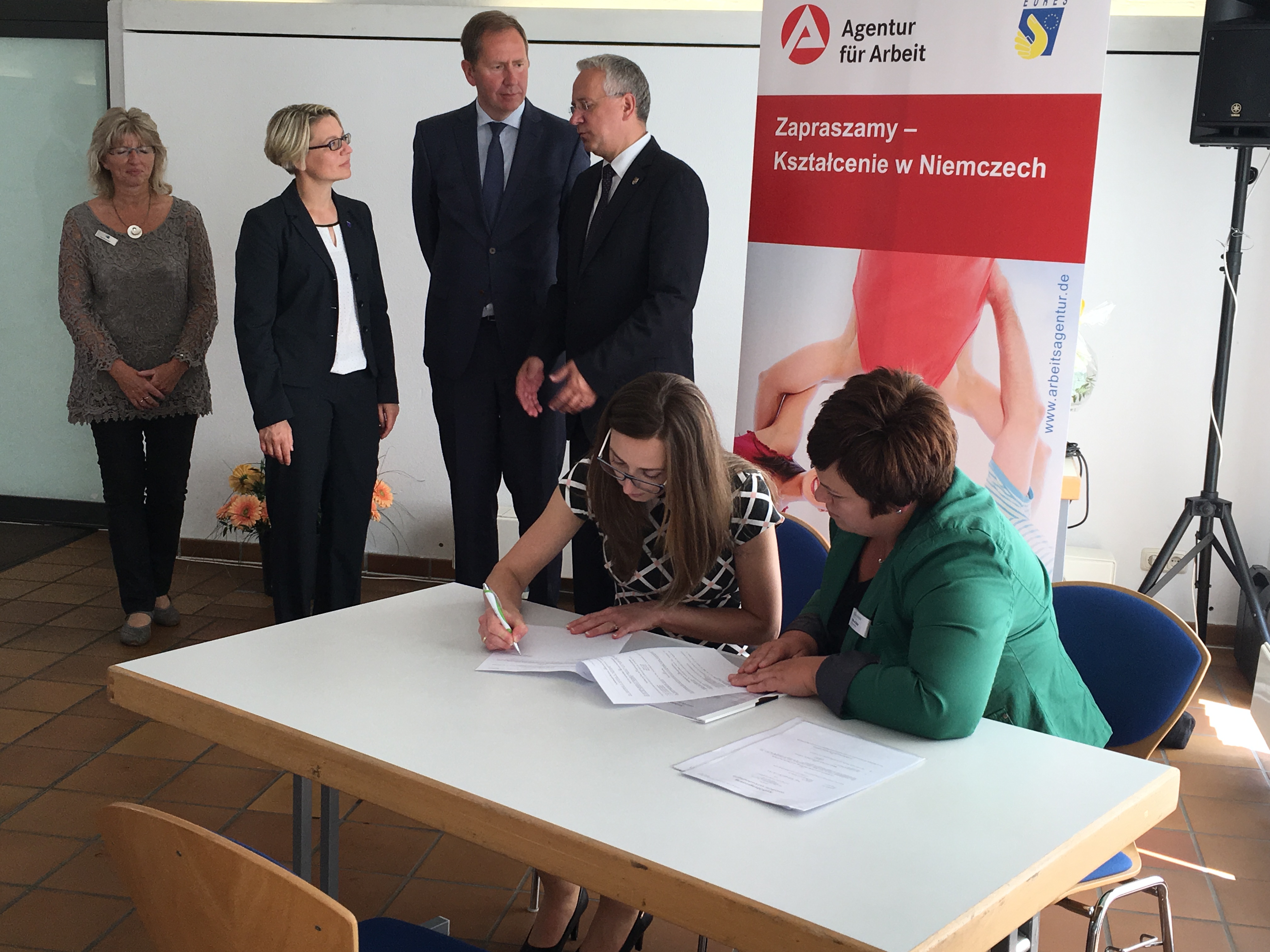 W czwartek w niemieckim Pasewalku, 25 młodych osób z Polski podpisało umowy z tamtejszymi pracodawcami by od września rozpocząć naukę zawodu – z niem. Ausbildung. W ramach programu edukacyjnego „Główka pracuje – Cleveres Köpfchen” z możliwości kształcenia w Niemczech łącznie skorzystało już ponad 100 osób.