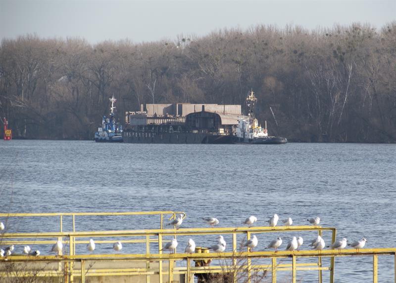 Transport stalowych elementów odbywa się na pontonie. Zostały one załadowane z placu przy pochylni Wulkan i odpłynęły do Świnoujścia, gdzie czekały na korzystne warunki pogodowe.