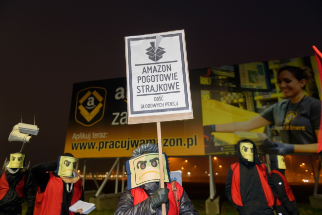 Kilkudziesięciu pracowników Amazon Fulfillment Poland sp. z o.o. wzięło udział w czwartek w akcji protestacyjnej przeciwko zmuszaniu do nadgodzin i niskim wynagrodzeniom w magazynie w podpoznańskich Sadach.