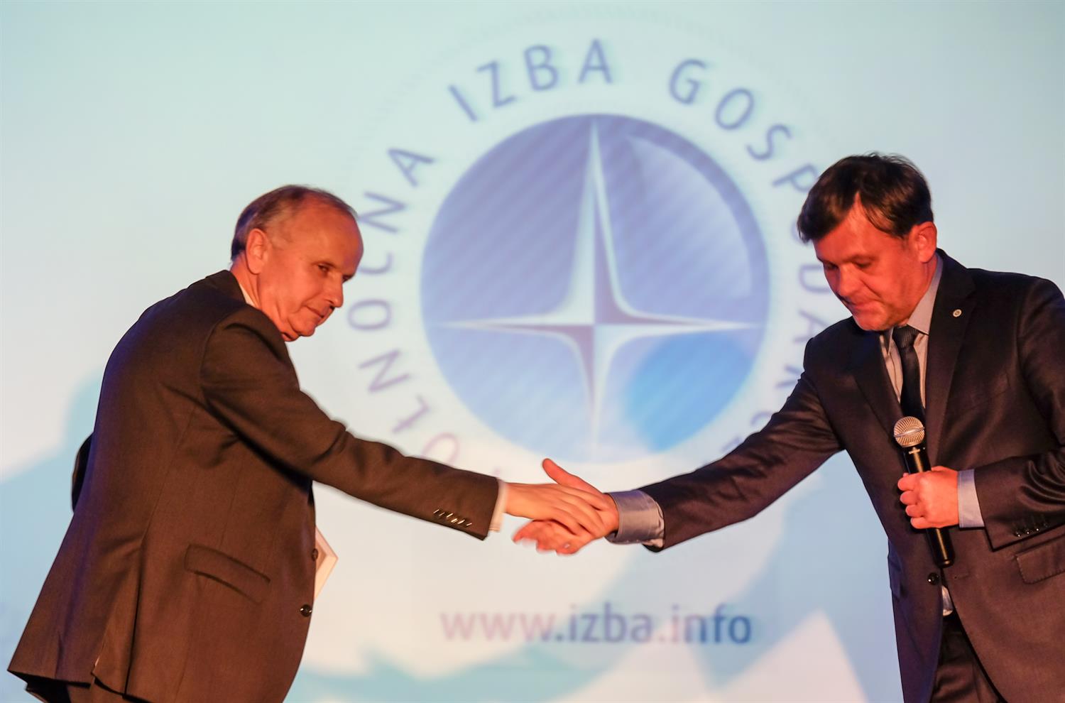 NZ.: Prof. Grzegorz Kołodko wita się z Dariuszem Więcaszkiem, prezesem PIG w Szczecinie.