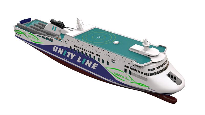 Na zdjęciu: Promy będą proekologiczne niskoemisyjne, napędzane czterema silnikami LNG typu Dual-Fuel ze wspomaganiem bateryjnym (hybryda).