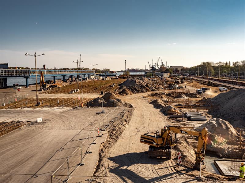 Wykonawca – Budimex – przejął plac budowy 19 września 2019 roku i od tego momentu terminal niemal z każdym dniem zmienia swoje oblicze. Zniknęły stare magazyny, dawne rampy przeładunkowe oraz dotychczasowe wyposażenie stanowisk promowych nr 5 i 6. Usunięto nawierzchnię i podbudowę wcześniejszych parkingów, a także umocnienia dna na długości 300 metrów.