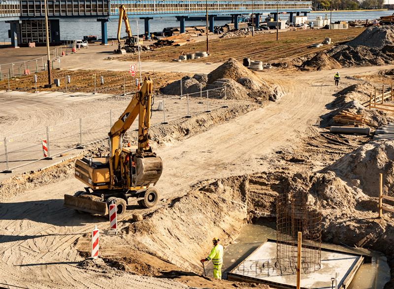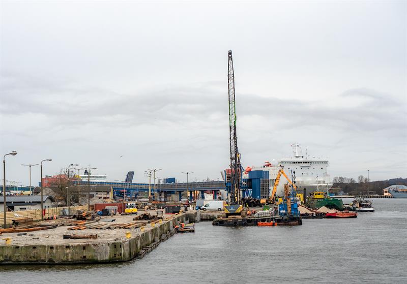 Obecnie prowadzone są prace, polegające na wbijaniu pali pod konstrukcję nowego nabrzeża, oraz pod konstrukcję wsporczą estakady. Trwają też roboty ziemne, obejmujące profilowanie podłoża pod warstwy konstrukcyjne nawierzchni placów postojowych. Układana jest kanalizacja deszczowa. W toku są roboty elektryczne, teletechniczne oraz zbrojarskie pod fundamenty oświetlenia i przygotowawcze pod przebudowywany układ torów kolejowych.