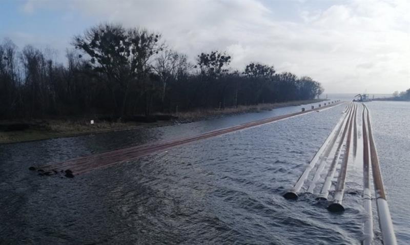 Z portu w Trzebieży odbywają się przeholunki rurociągów, które po montażu czeka zatopienie na dnie Zalewu Szczecińskiego – po wschodniej stronie toru wodnego Świnoujście – Szczecin. To prace przygotowawcze przed pogłębianiem toru do 12,5 m. Rurociągami będzie transportowany urobek, z którego powstaną dwie sztuczne wyspy.