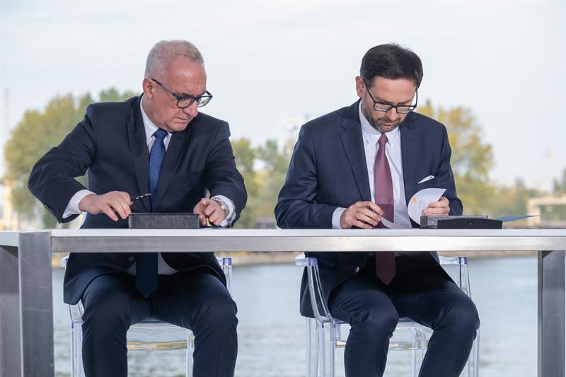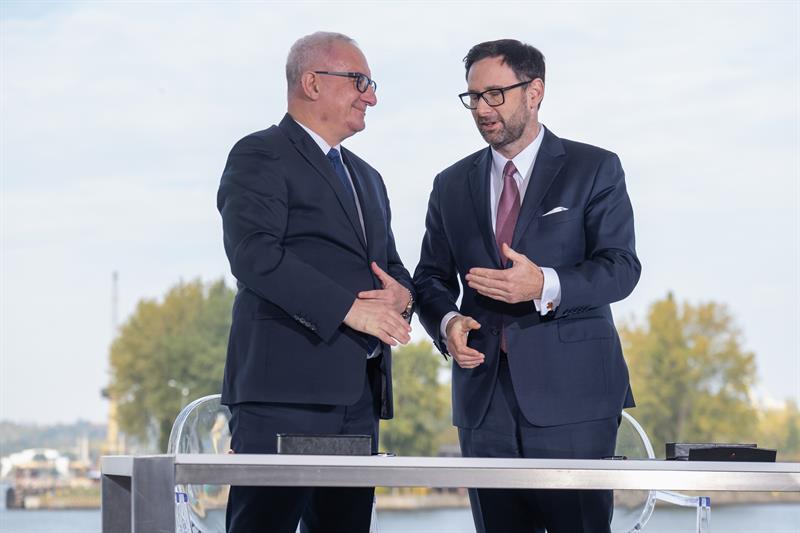 Na konferencji w szczecińskim porcie poinformowano o nowych inwestycjach na Pomorzu Zachodnim, związanych z budową morskiej farmy wiatrowej Baltic Power. Na zdjęciu: Krzysztof Urbaś (z lewej), prezes Zarządu Morskich Portów Szczecin i Świnoujście oraz prezes PKN Orlen Daniel Obajtek. Fot. Dariusz GORAJSKI