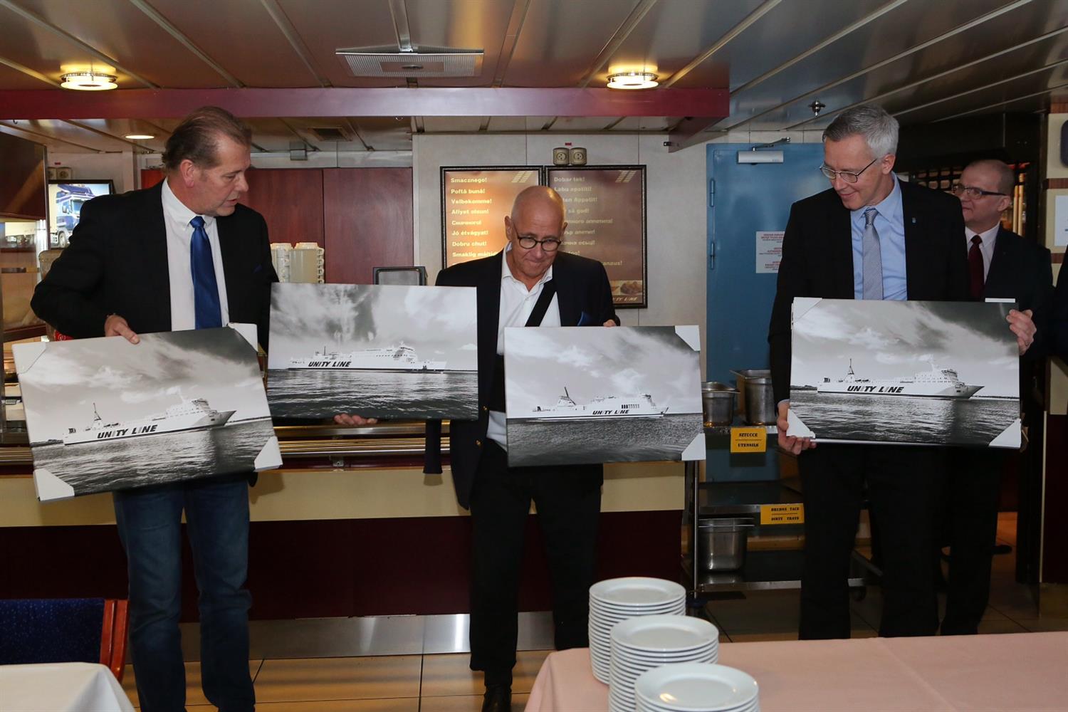 Dyrektor Unity Line Jarosław Kotarski oraz szef portu w Trelleborgu Tommy Halén podziękowali zgromadzonym za owocną współpracę. Symbolicznym prezentem od szwedzkiego zarządcy było efektowne koło sterowe.