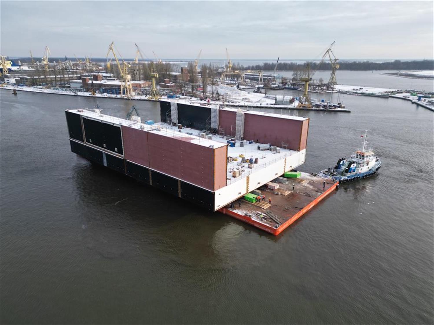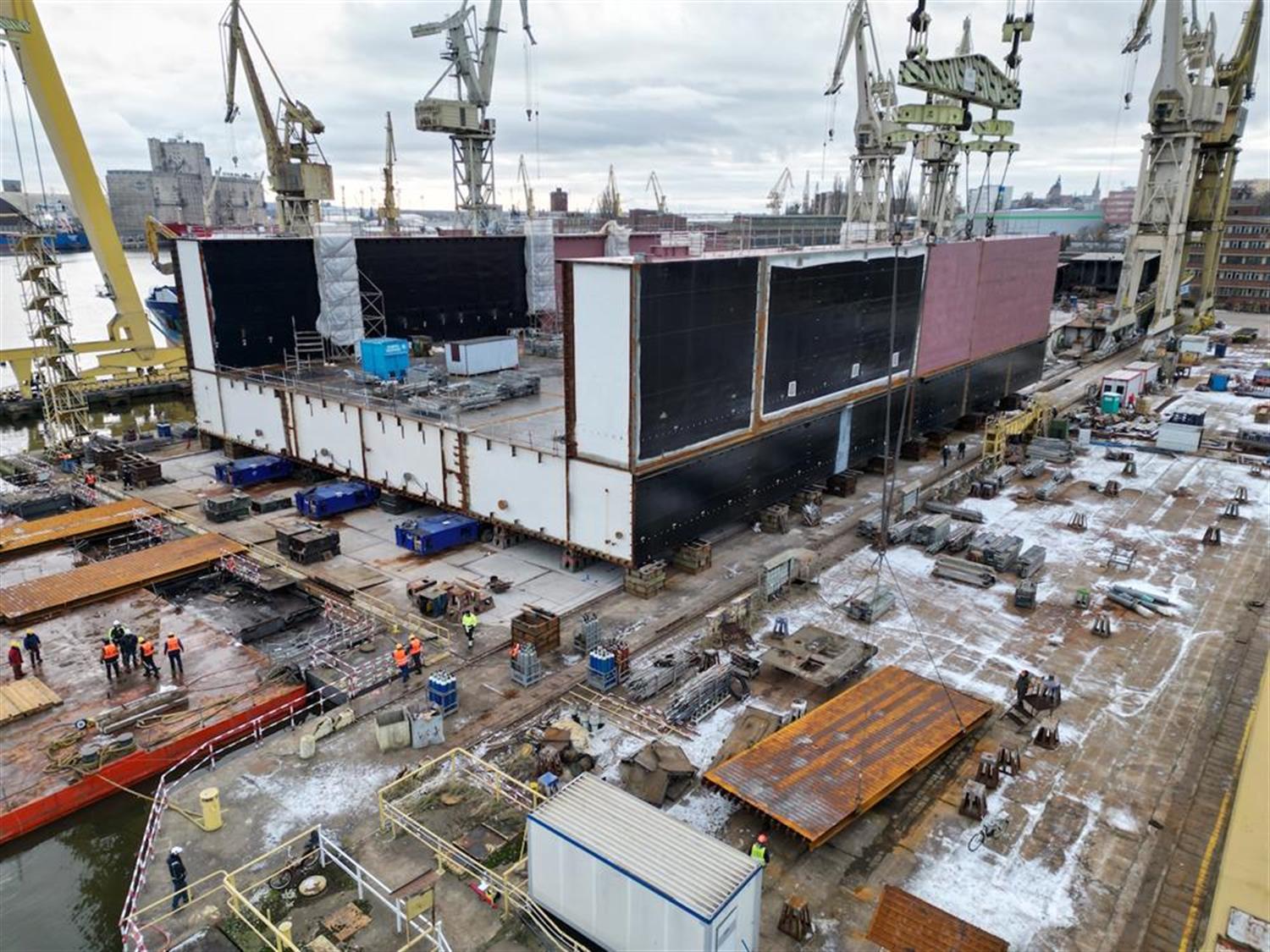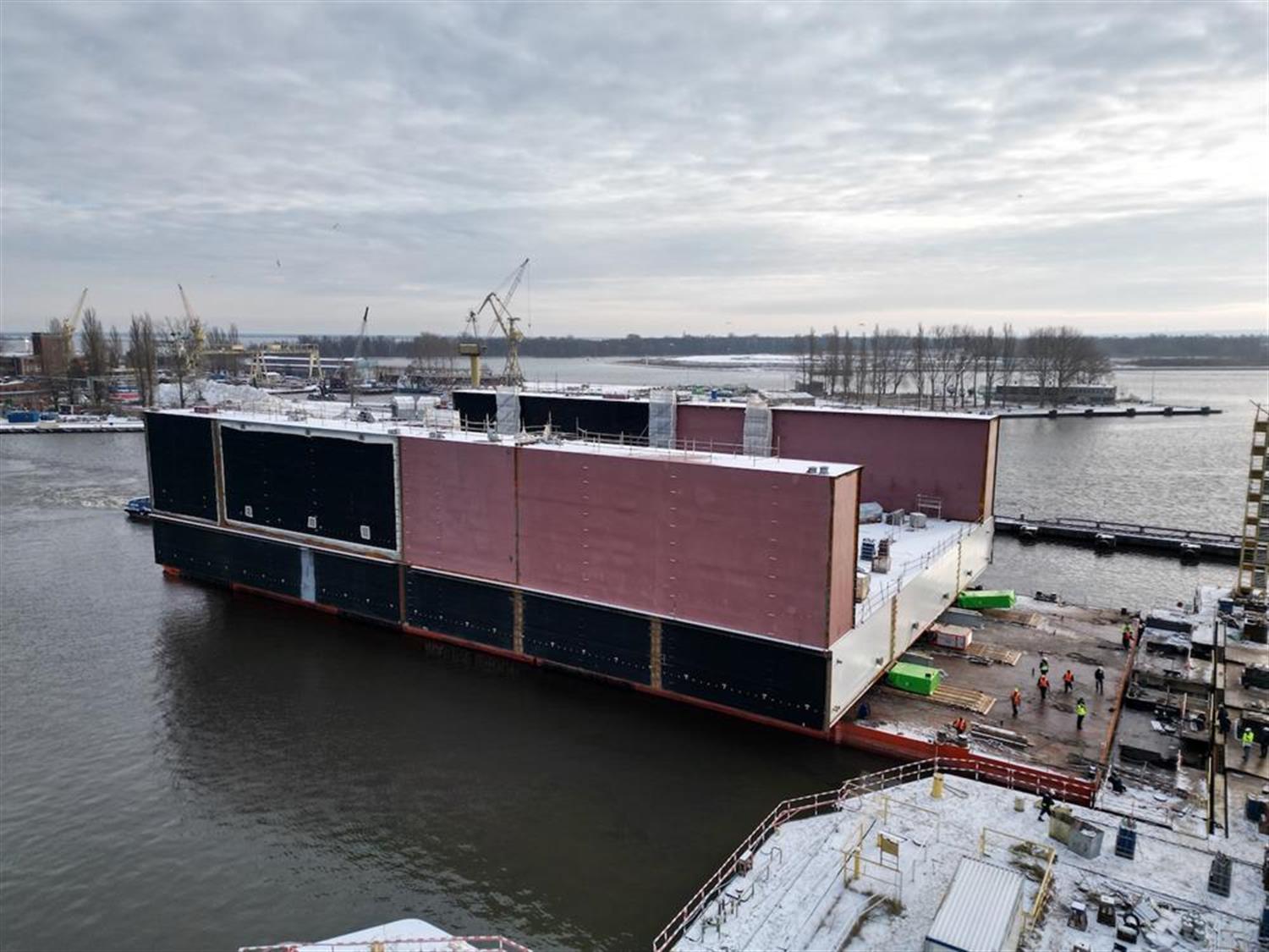 Moduł doku został wtoczony za pomocą samojezdnych zestawów podnośnikowych z pochylni Odra Nowa na ponton „Carrier 17”, który dopłynął do nabrzeża Drzetowskiego. To pierwszy z trzech bloków, który wkrótce będzie zwodowany. Gdy gotowe będą wszystkie trzy moduły, zostaną połączone na wodzie i wyposażone.