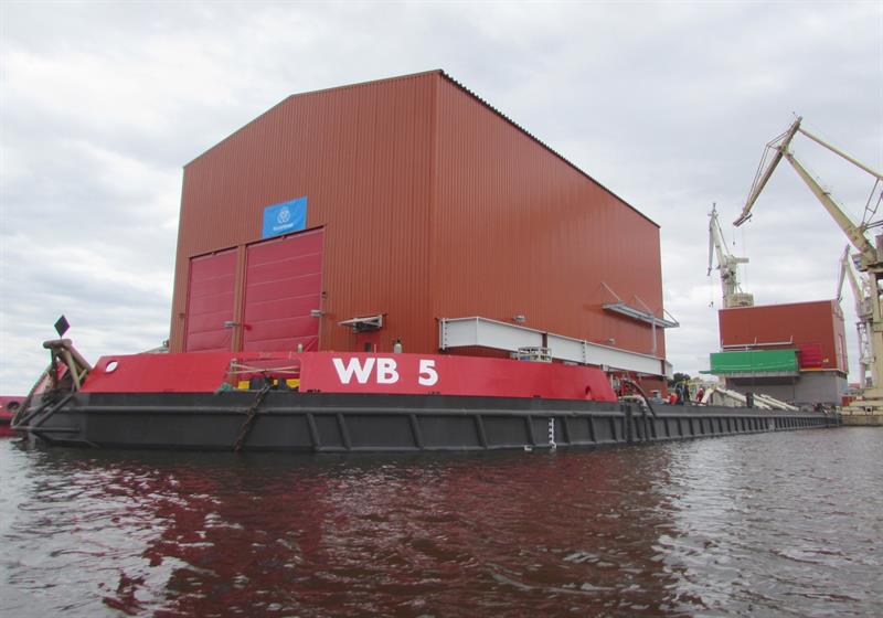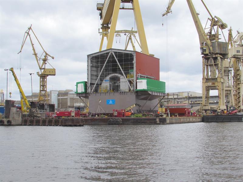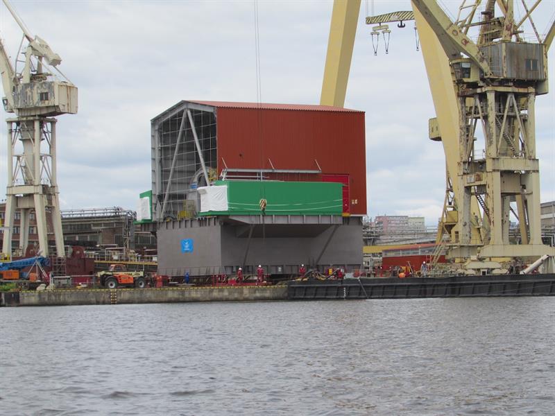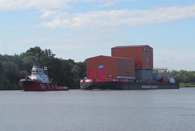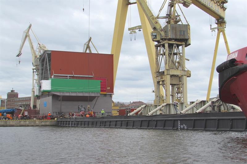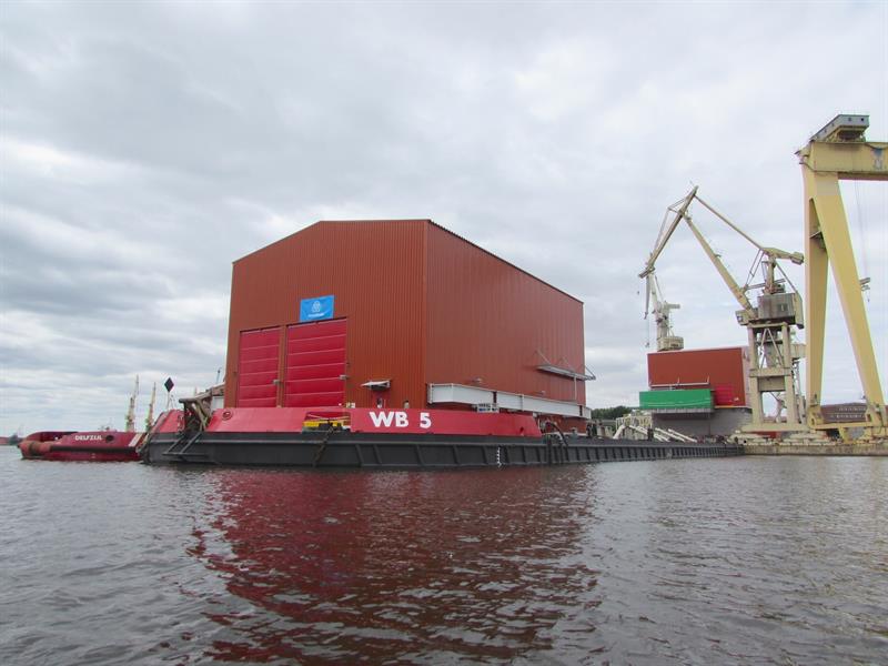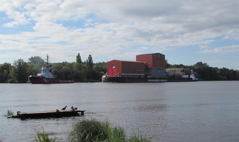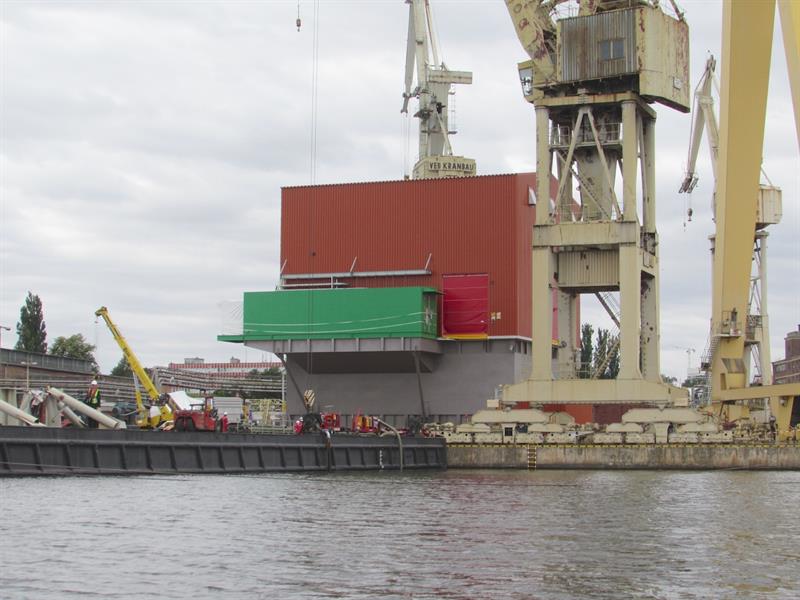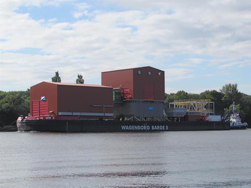 Przeładunek z nabrzeża na ponton z floty Wagenborga rozpoczął się na początku lipca. Wykorzystując specjalne systemu wózków samojezdnych poszczególne podzespoły trafiały na pokład.