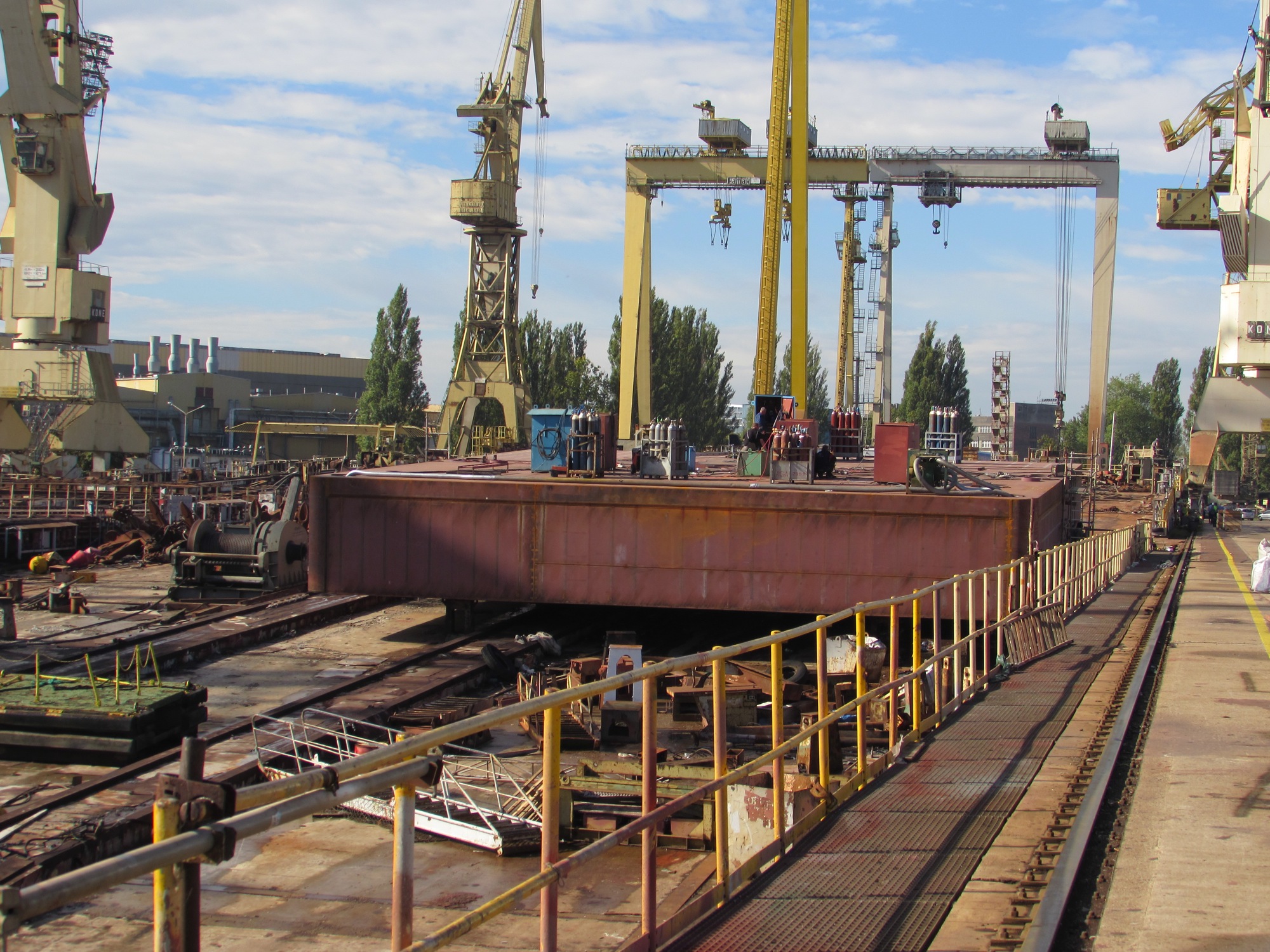 Na Wulkanie gęsto od rozmaitych jednostek. Blisko wody stoi „pływająca przystań”, wykonana również przez PTS – dla norweskiej gminy Kristiansund. Za nią trwają prace przy pontonie, a dalej na placu kończone są niewielkie statki.