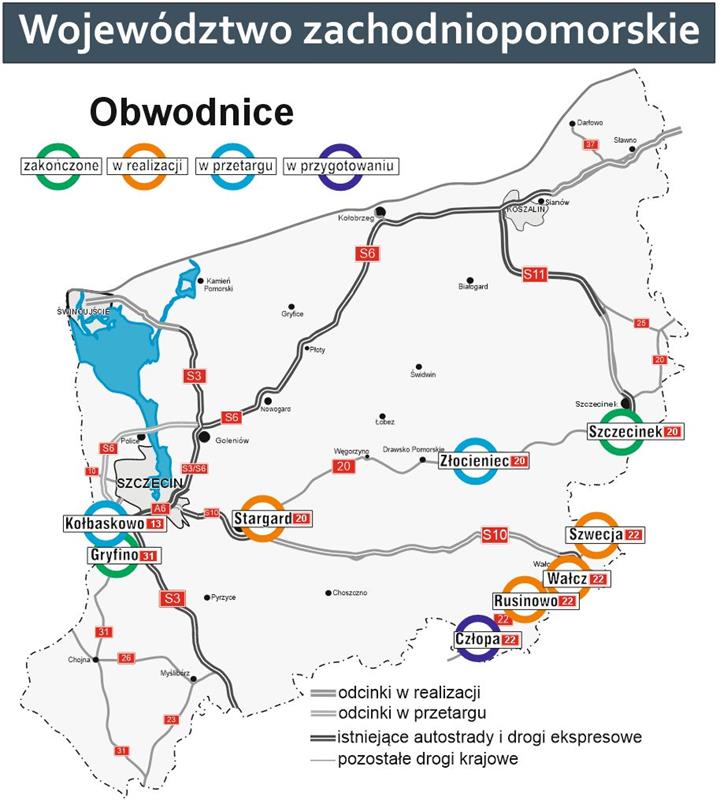 Do tej pory w województwie zachodniopomorskim oddano do ruchu dwie inwestycje realizowane w ramach rządowego Programu budowy 100 obwodnic. Pierwszą z nich jest obwodnica Gryfina w ciągu DK31, z której kierowcy korzystają od grudnia ubiegłego roku. Na koniec kwietnia udostępniliśmy do ruchu obwodnicę Szczecinka w ciągu DK20. Od wiosny tego roku trwa budowa obwodnicy Szwecji w ciągu DK22. Wkrótce rozpoczną się też roboty na obwodnicy Wałcza i Rusinowa w ciągu DK22.