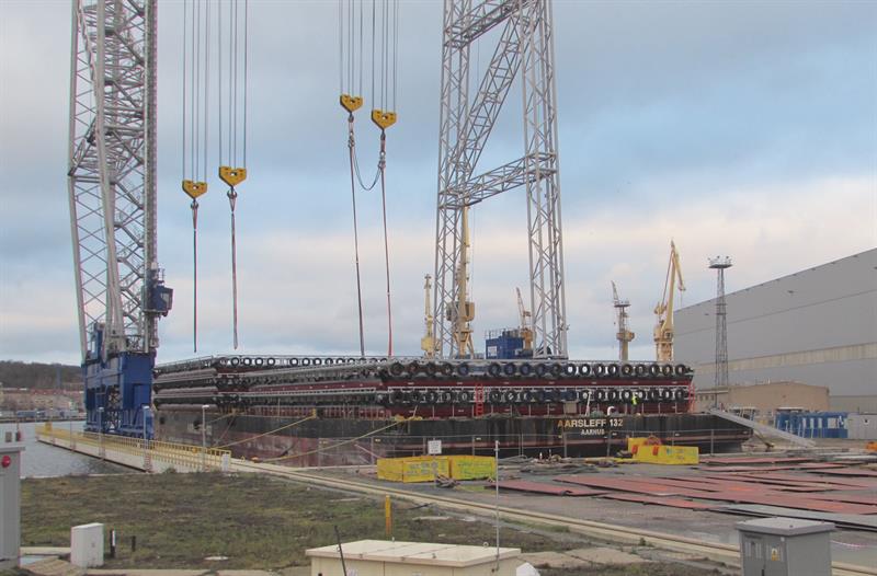 Na specjalną barkę „Aarsleff 132” załadowano tzw. karmniki dla łososi, czyli stalowe konstrukcje złożone z ram i dodatkowego wyposażenia. Jednostka, wraz z dwoma holownikami, w Nowy Rok miała odpłynąć ze Szczecina w kierunku Norwegii, ale pogoda na to...