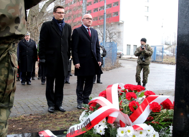Na zdjęciu: Prezydent Katowic Marcin Krupa (z lewej) i prezydent Chorzowa Andrzej Kotala składają kwiaty przed pomnikiem ofiar katastrofy.