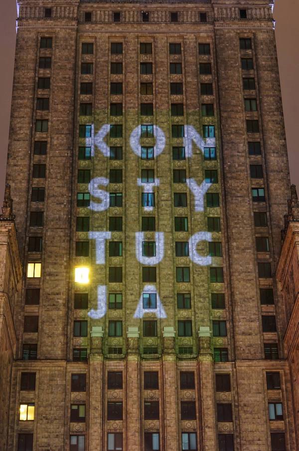 Na fasadzie Pałacu Kultury i Nauki w sobotę wieczorem pojawiła się iluminacja słowa "konstytucja". Organizatorem akcji byli Obywatele RP. W ocenie przewodniczącego PKW, sędziego Wojciecha Hermelińskiego, wyświetlany na PKiN napis „konstytucja” nie narusza ciszy wyborczej.