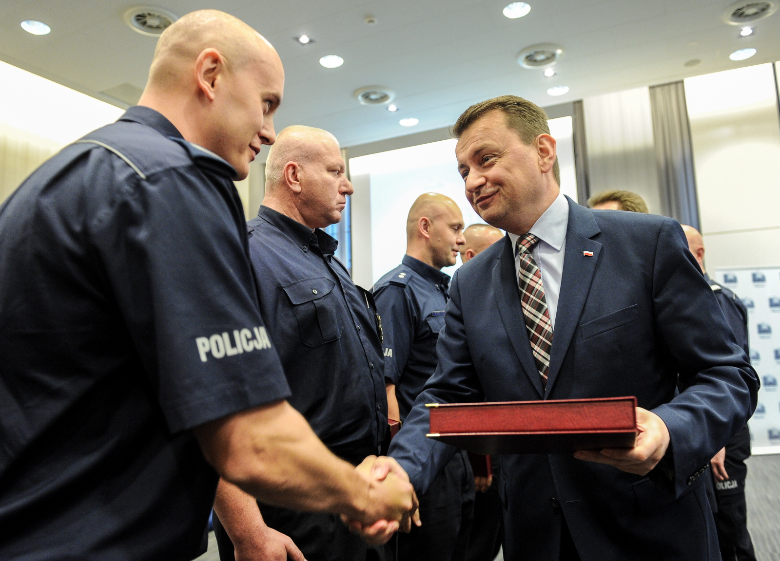 Na zdjęciu: Minister spraw wewnętrznych i administracji Mariusz Błaszczak wręcza odznaczenia dzielnicowym, podczas przedstawiania nowej koncepcji pracy dzielnicowych zawartej w programie "Dzielnicowy bliżej nas".