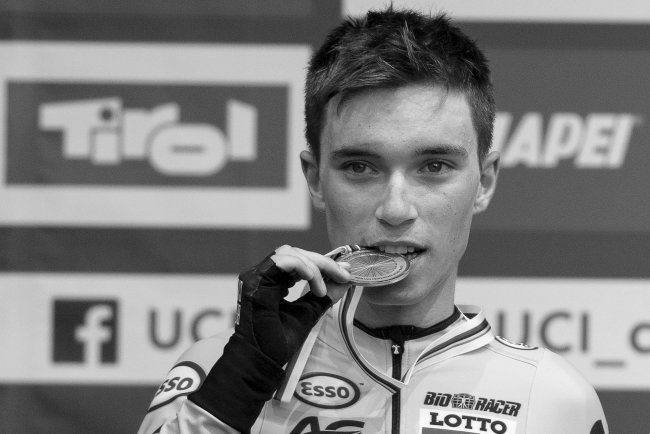 Na zdjęciu: Bjorg Lambrecht na podium ze srebrnym medalem mistrzostw świata do lat 23 w Austrii we wrześniu 2018 r.