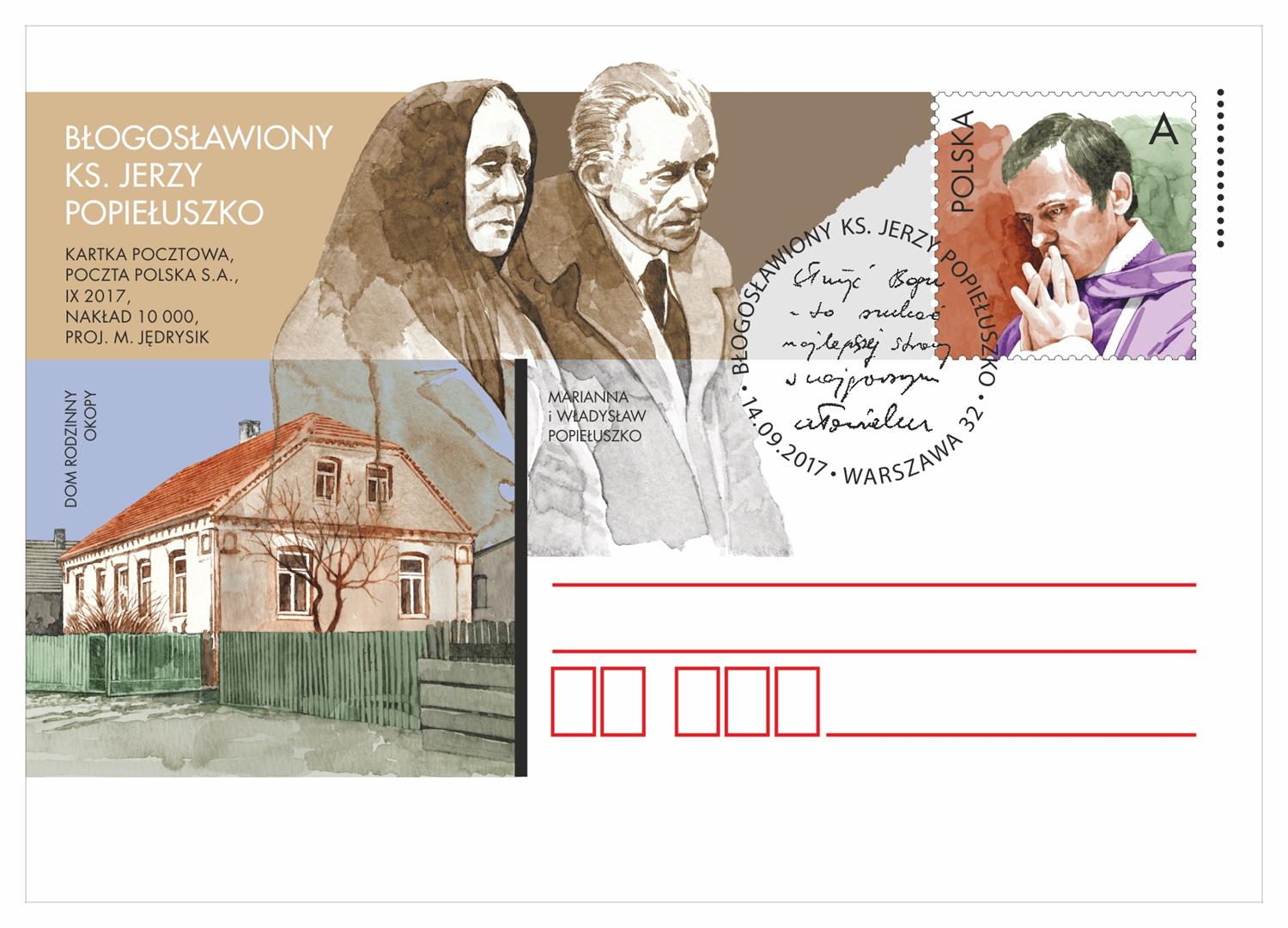Do obiegu wchodzi kartka pocztowa „Błogosławiony ks. Jerzy Popiełuszko”. Emisję Poczta Polska przygotowała na 14 września 2017 r. z okazji 70. rocznicy urodzin patrona „Solidarności".
