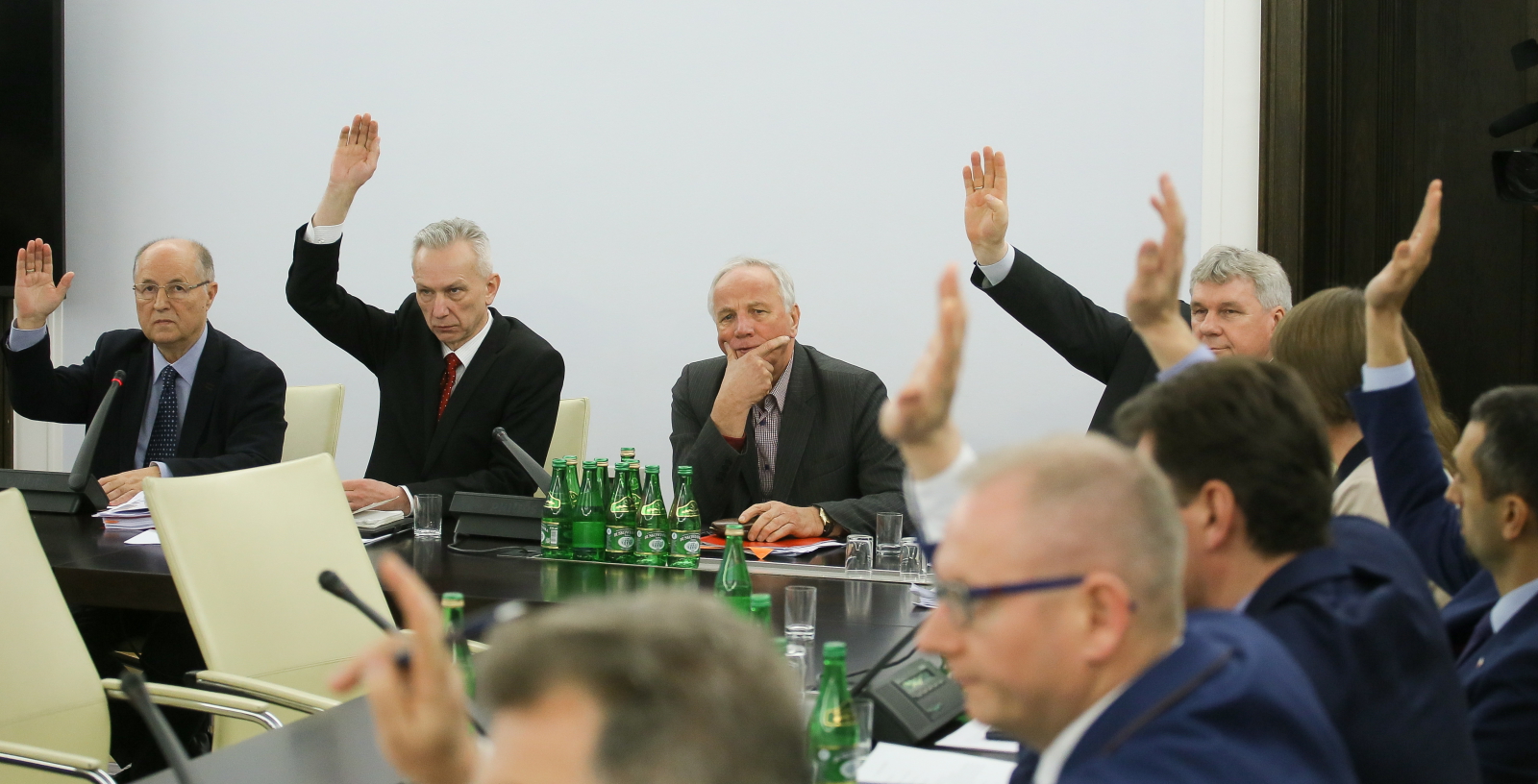 Przewodniczący Komisji Ustawodawczej Stanisław Gogacz (2L), senator PO Jan Rulewski (2P), senator PiS Robert Mamątow (P) i przewodniczący Komisji Praw Człowieka, Praworządności i Petycji Michał Seweryński (L), podczas głosowania na wspólnym posiedzeniu Komisji Ustawodawczej i Praw Człowieka, Praworządności i Petycji, 23 bm. w Senacie w Warszawie. Senackie komisje wniosły, aby Izba przyjęła bez poprawek nowelizację ustawy o Trybunale Konstytucyjnym autorstwa PiS, którą 22 grudnia uchwalił Sejm. Teraz nowelizacją zajmie się cały Senat. Fot. PAP/Paweł Supernak