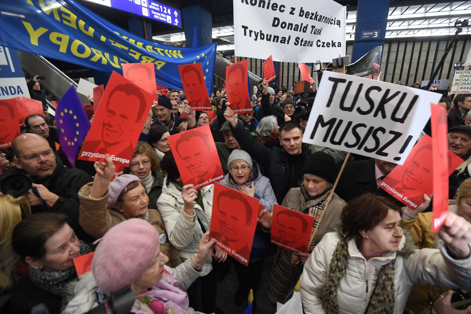Na dworzec przybyli m.in. działacze KOD z flagami UE; niektórzy zgromadzeni trzymają portrety Tuska na czerwonym tle z napisem: "przystanek Europa", niektórzy krzyczą: "Precz z Kaczorem", "Wolna Polska bez Kaczora", a do Donalda Tuska: "jesteśmy z tobą".