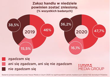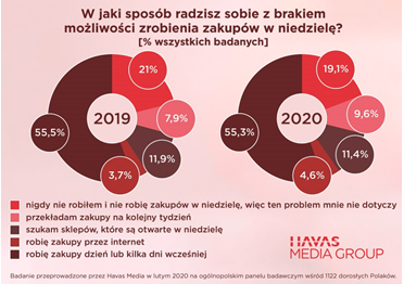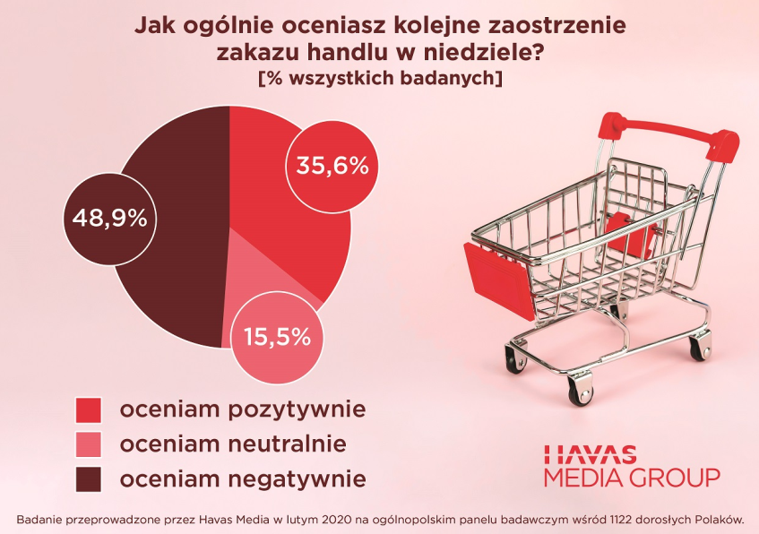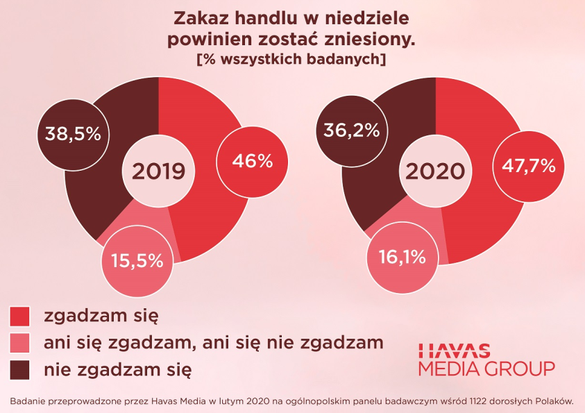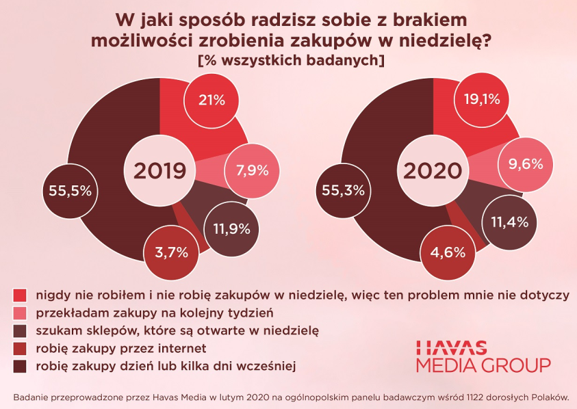 – Zakaz handlu obowiązuje od 2018 r., w tym roku poza kilkoma wyjątkami, obejmie już wszystkie niedziele w miesiącu. Nasze badania pokazują, że nastawienie Polaków w tej kwestii nie zmienia się znacząco. Polacy wciąż deklarują, że chcieliby zniesienia zakazu, a nowe zaostrzanie przepisów oceniają negatywnie. Mimo że stopniowo przyzwyczailiśmy się do braku możliwości zakupów w niedziele i planujemy zakupy wcześniej, to dla jednej trzeciej Polaków stanowi on w dalszym ciągu duże utrudnienie – komentuje Anna Ostrowska, Insight Specialist w Havas Media Group.