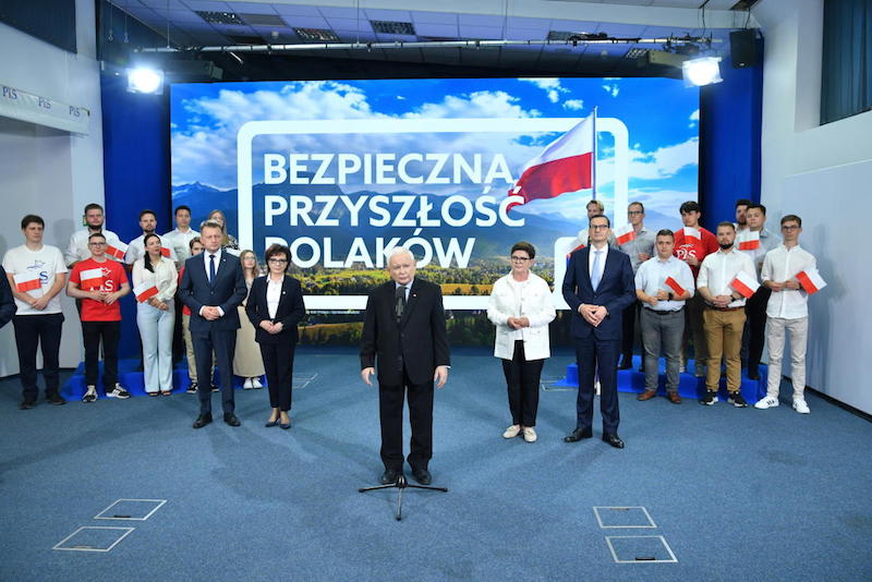 "Nasze hasło to +Bezpieczna Przyszłość Polaków+" - ogłosił prezes PiS, któremu towarzyszli: marszałek Sejmu Elżbietą Witek, wiceprezesi PiS - premier Mateusz Morawiecki i szef MON Mariusz Błaszczak oraz europosłanka PiS, b. premier Beata Szydło.